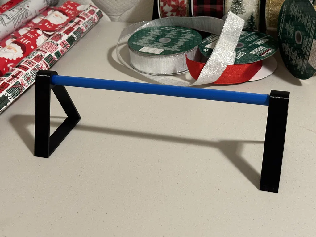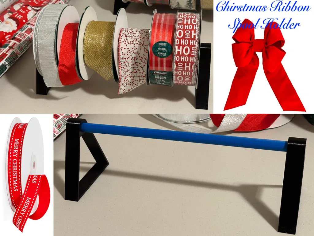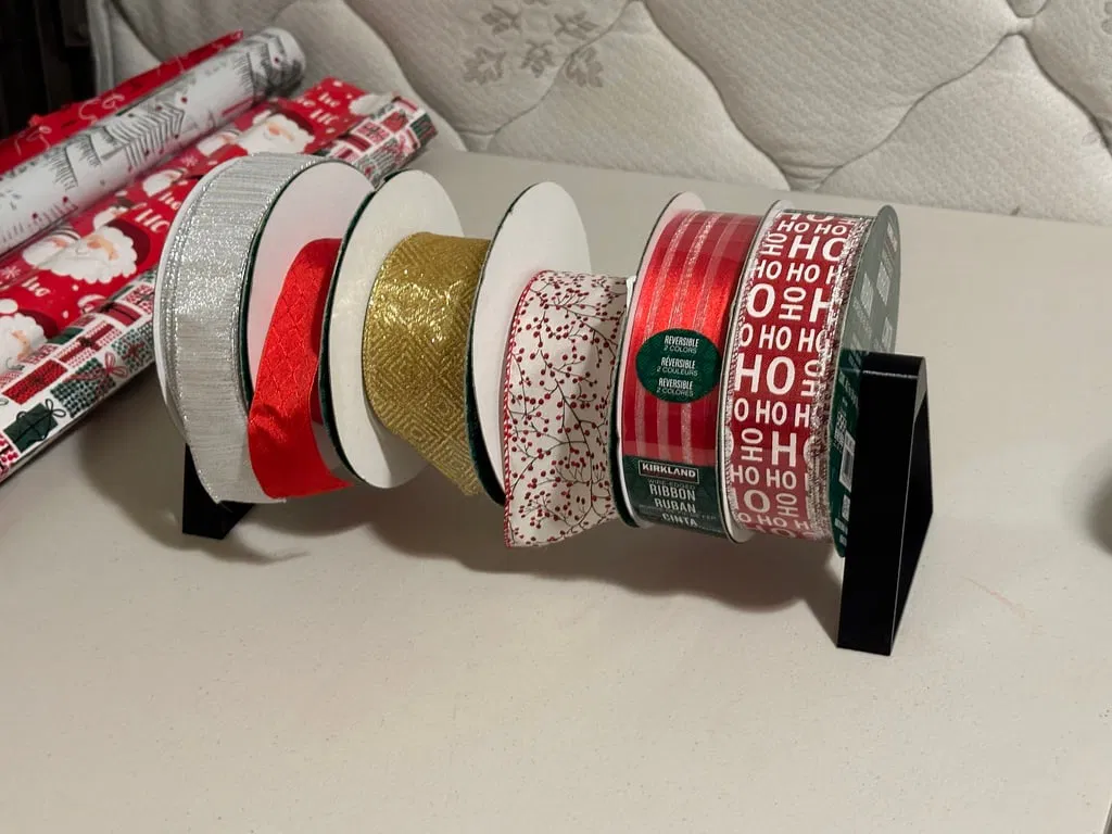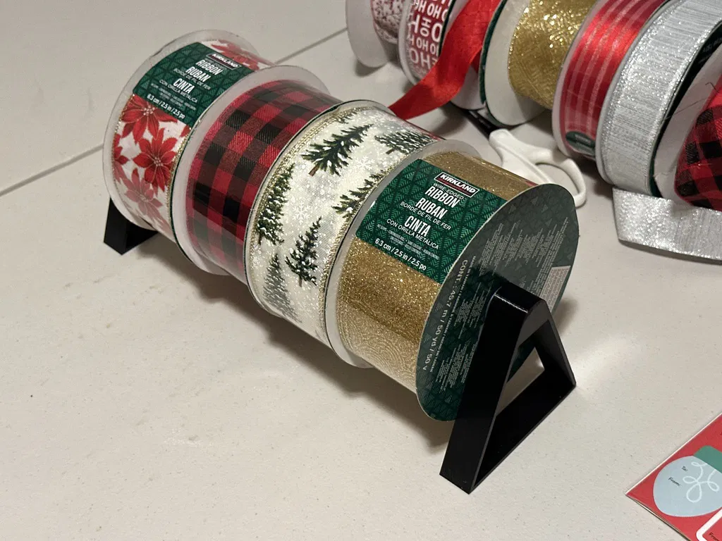 Giá đỡ cuộn ruy băng đơn giản. Thiết kế cho cuộn Kirkland Costco nhưng thanh đỡ mỏng, vừa nhiều loại ruy băng. Có 2 kích cỡ thanh đỡ (18cm và 36cm), có thể scale theo ý. Không cần supports.