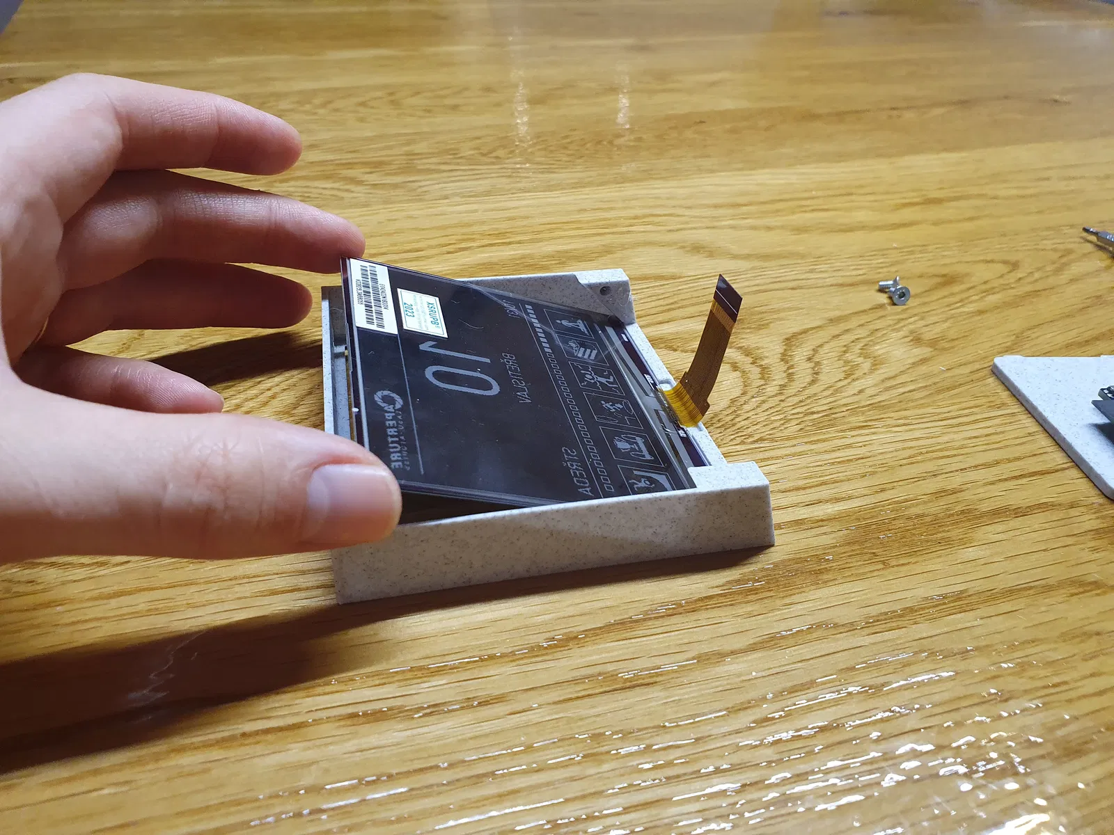 Màn hình Epaper Thiết kế này dùng để chạy dịch vụ zivyobraz.eu, nơi bạn có thể tùy chỉnh mọi thứ trên màn hình e-paper (lịch, ngày tháng, dữ liệu cảm biến, dữ liệu Home Assistant, v.v.). #### Các phiên bản của mẫu Có thể gắn cảm biến theo 2 cách - có 2 phiên bản mẫu được tải lên: Vít 2mm (lỗ 1.9mm) * Gắn trượt vào chốt ### Hướng dẫn lắp ráp 1. Đặt màn hình vào khung.