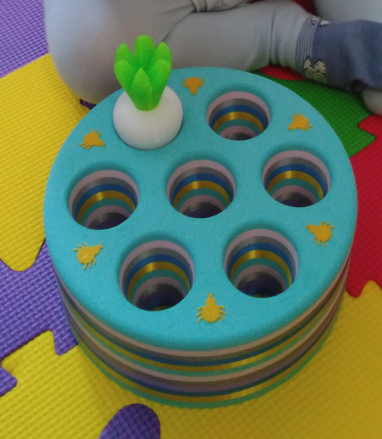 Trồng cà rốt. Củ cà rốt vừa với tất cả các lỗ, bé sẽ không bực mình vì bộ phận không khớp. Giúp bé nhận biết màu sắc và rèn luyện khả năng cầm nắm.