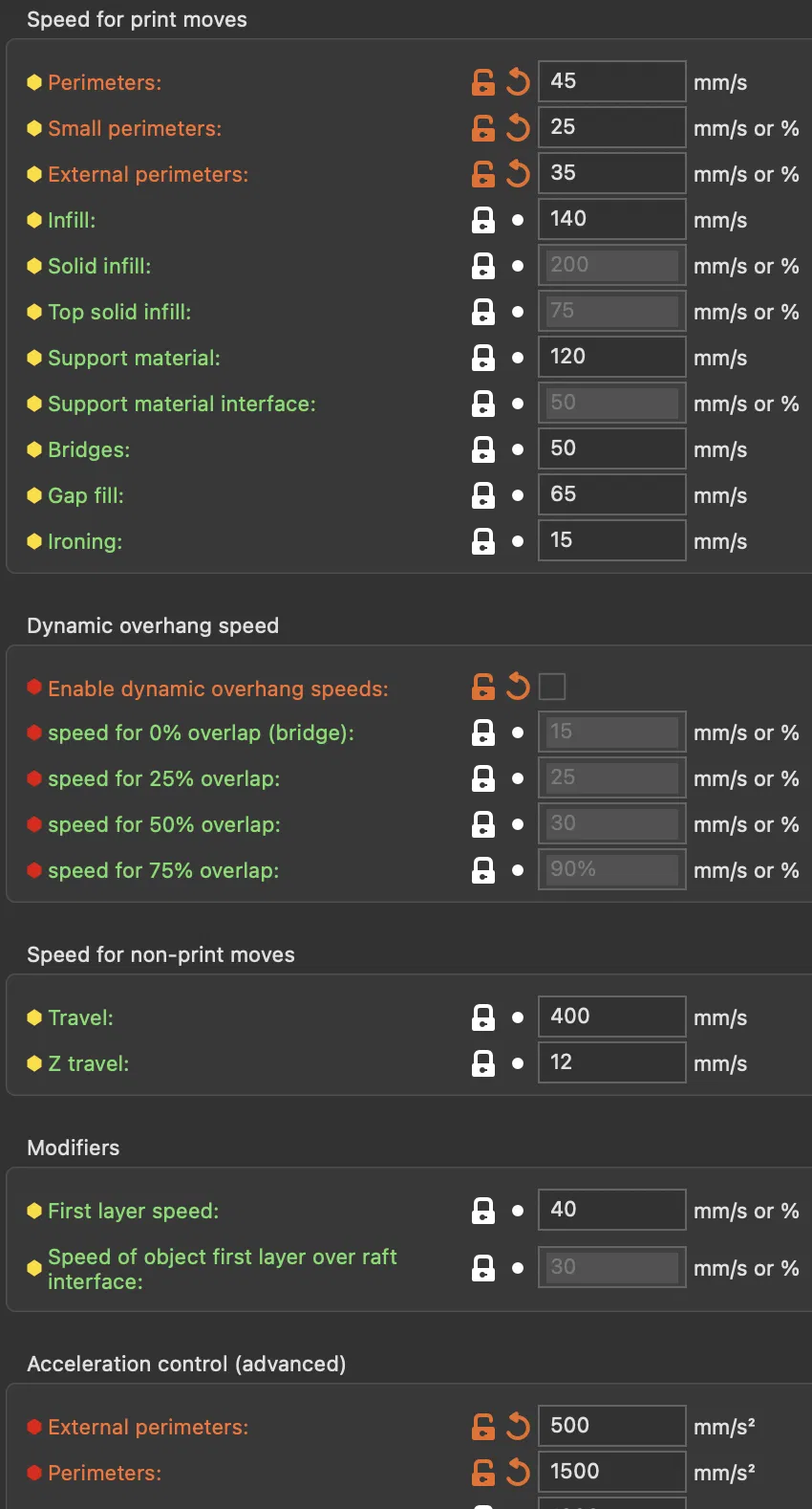 Cài đặt tốc độ và gia tốc trong ảnh chụp màn hình thứ hai (tốc độ chậm + gia tốc thấp cho các lớp ngoài cùng).