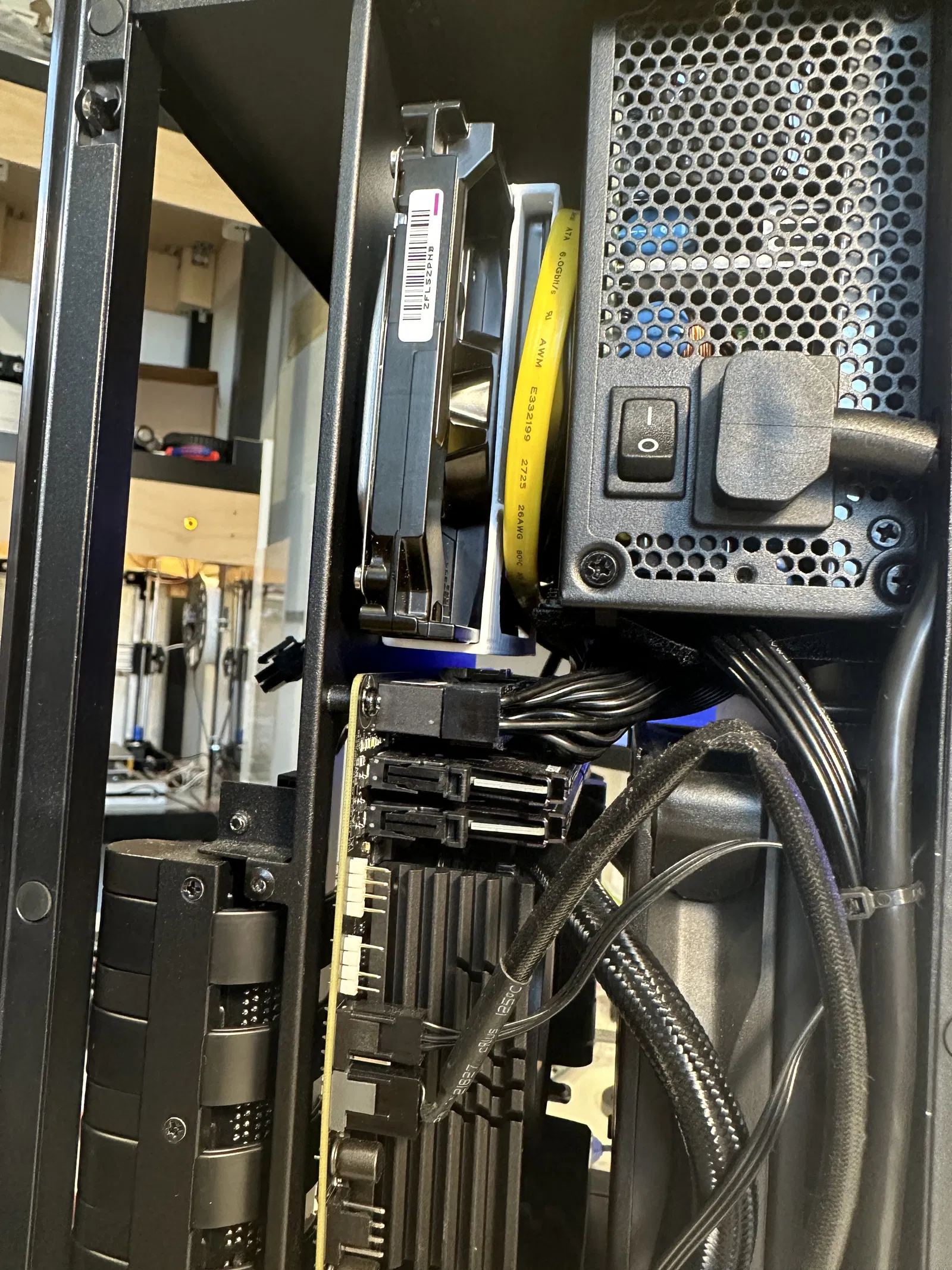 Phần đế được vát nhẹ để các ổ đĩa treo dọc, giúp chừa càng nhiều không gian càng tốt cho bộ nguồn (PSU). Dây cáp SATA có thể được giấu tiện lợi ở đó. Các ổ đĩa có thể vừa vặn phía sau nắp che ngay cả khi đầu cáp SATA thẳng. Cần có khoảng trống thoải mái giữa các đầu nối của bo mạch chủ và ổ cứng (HDD).