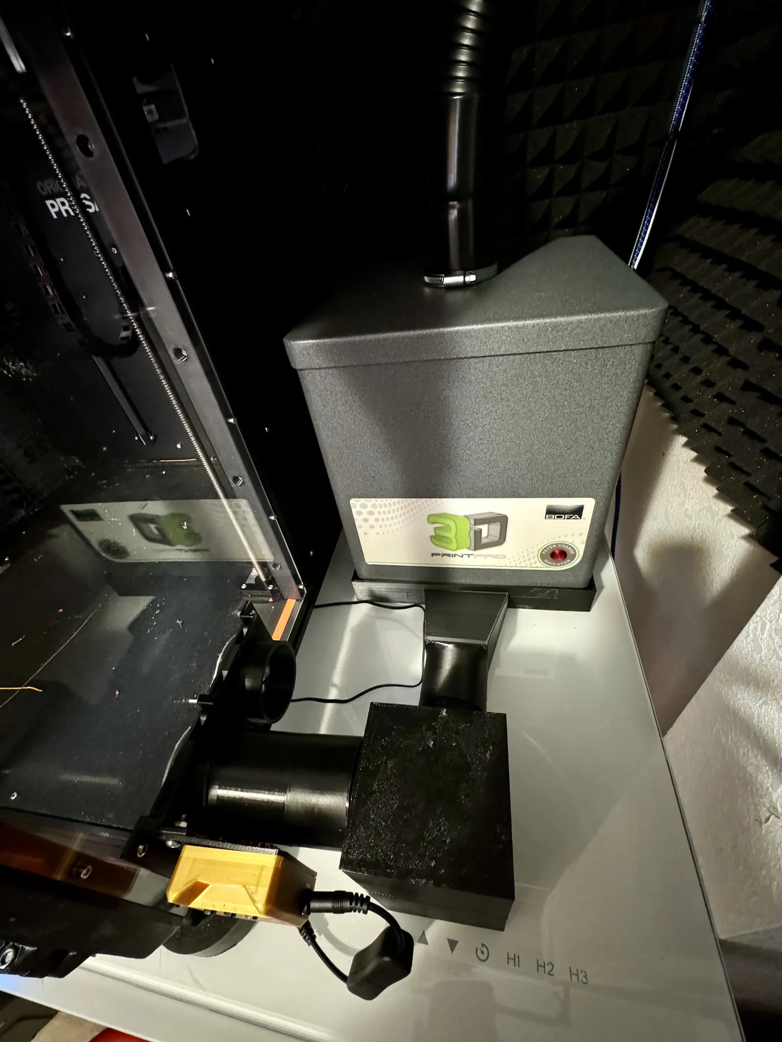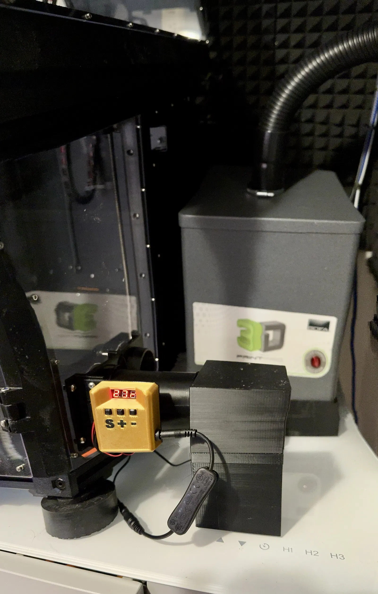 Trước đó, tôi đã gắn thêm một bộ lọc BOFA Print Pro 2 vào mặt sau phía trên của EnXLosure để lọc khí thải. Sau đó, tôi nhận ra mình đang lãng phí không khí ấm nên đã quyết định cho khí đã lọc lưu thông ngược trở lại vào EnXLosure để giúp duy trì nhiệt độ. Ban đầu, tôi đã nghĩ đến việc dùng ống mềm, nhưng tôi nghi ngờ các rãnh trên ống sẽ cản trở luồng không khí (chưa kể không gian nhỏ có sẵn sẽ không phù hợp với ống BOFA đi kèm). Vì BOFA thải khí từ phía dưới bộ lọc, tôi đã chế tạo một bệ đỡ nâng cao, có khe thoát khí ở bên hông, để hút khí thải đã được lọc ra. Phần còn lại của các bộ phận sẽ dẫn khí đến cụm quạt gắn trên tấm acrylic. Đối với hệ thống kiểm soát nhiệt độ, tôi dành một quạt (luôn bật) để hút không khí từ luồng khí thải của BOFA. Quạt còn lại, được điều khiển bằng nhiệt độ, sẽ thổi khí mát vào khi cần thiết để duy trì nhiệt độ của EnXLosure. Đây là liên kết đến hệ thống điều khiển nhiệt độ ban đầu mà tôi đã thử nghiệm: . Đối với việc triển khai này, tôi cần đảo ngược cụm vỏ để gắn vào bên trái của cụm quạt. Cụm quạt yêu cầu sử dụng cưa lỗ để khoét 2 lỗ trên tấm acrylic bên hông nhằm phù hợp với luồng không khí. Tôi đã cân nhắc việc in một tấm bên mới, nhưng kích thước quá lớn so với bàn in XL, vì vậy thay vì in 2 tấm lồng vào nhau, tôi chỉ cần khoét lỗ. Bạn sẽ cần khoan 4 lỗ 4mm để gắn cụm quạt vào tấm panel, và 1 lỗ 4mm cho đầu dò nhiệt độ. Mặc dù có sự chênh lệch đáng kể giữa nhiệt độ phía trên và phía dưới EnXLosure (khoảng 9C), việc hiểu được độ lệch này cũng khá dễ dàng. Bản dựng này khá là đặc biệt nên tôi chưa cung cấp thêm chi tiết (như cụm quạt) vào lúc này. Nếu có đủ người quan tâm, tôi có thể bổ sung thêm chi tiết lắp ráp/chuẩn bị.