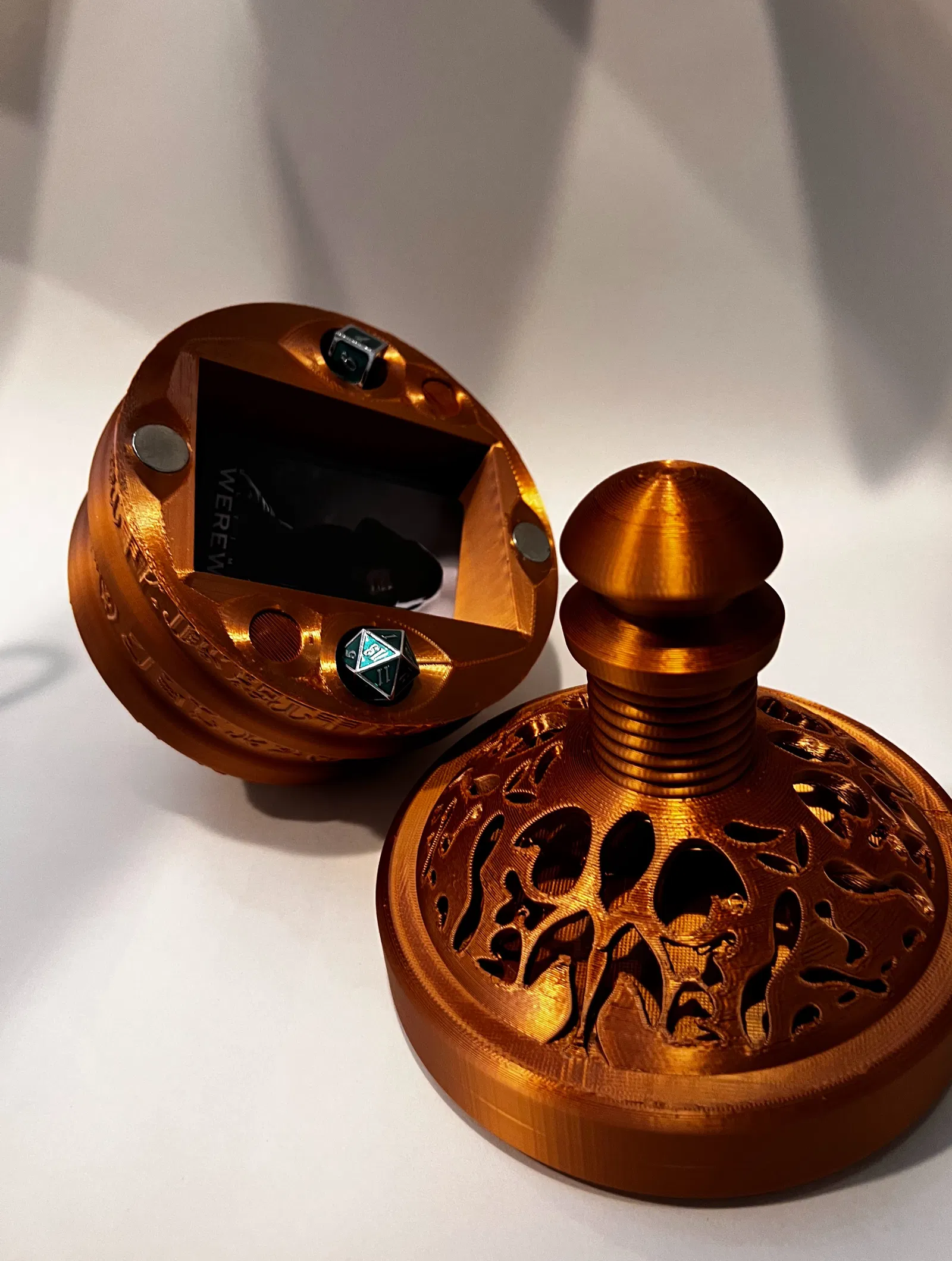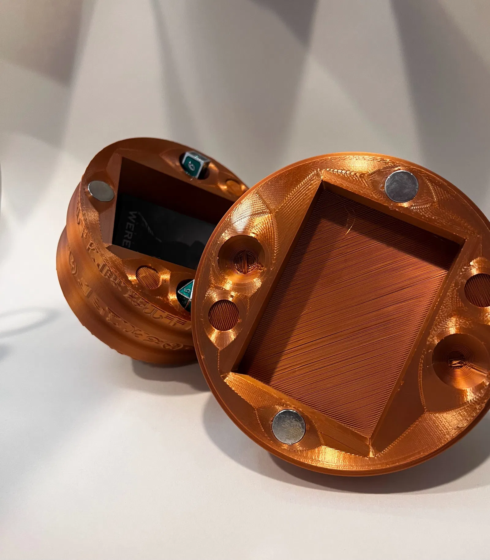 Tôi đã thiết kế một hộp đựng bài vừa vặn cho 100 lá bài bọc trong kích thước tiêu chuẩn và 2 viên xúc xắc 20 mặt. Bạn sẽ cần nam châm để gắn hai phần trên và dưới lại với nhau. Mẫu này được thiết kế không cần vật liệu hỗ trợ (supportless) và có một số phần cần dùng cầu nối (bridging). Thú thật là có một vài chỗ trên mẫu này cần chỉnh sửa để có bề mặt đẹp hơn, nhưng nhìn chung thì chất lượng in ra cũng khá ổn. Loại nam châm bạn cần là loại 15mmx2mm. Đó là loại hình trụ. Vui lòng đăng ảnh sản phẩm nếu bạn làm ra mẫu này nhé! Không gian bên trong để chứa bài là 100mmX70mmX70mm. Chúc bạn in ấn vui vẻ. Cập nhật: Tôi đã chỉnh sửa khoang đáy để in tốt hơn khi dùng cầu nối. Tôi cũng đã thêm một tệp trang trí nếu bạn muốn in bằng máy in resin chỉ để có một mặt trên vật lý không có chức năng gì khác ngoài việc trang trí. Ngoài ra, tôi cũng đã đính kèm một cái giá đỡ. Nó không đẹp lắm nhưng chắc chắn là hoạt động tốt để giữ hộp, điều này khá hay vì trước đây nó cứ nằm lung tung. Đây là các loại nam châm có thể phù hợp. amazon.com/VSKIZ-Different-Muti-use-Neodymium-Whiteboard/dp/B0BZYNZQKS/ref=sr_1_1_sspa?crid=OUWZE6DUFQIU&keywords=15mmx2mm+neodymium+magnets&qid=1692371129&s=industrial&sprefix=15mmx2mm,industrial,107&sr=1-1-spons&sp_csd=d2lkZ2V0TmFtZT1zcF9hdGY&th=1 Nếu bạn muốn ủng hộ tôi, hãy thử phiên bản bắt vít của mẫu này nhé.