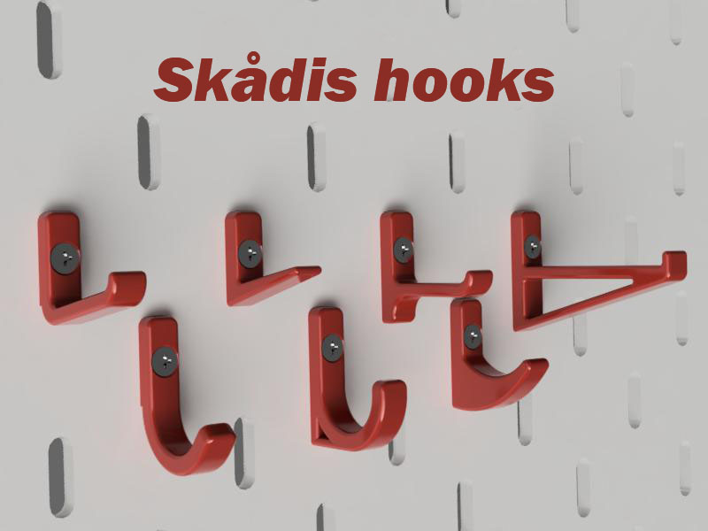 Tuyển tập móc treo đồ đa dạng hình dáng và kích cỡ cho bảng IKEA Skadis, gắn chắc chắn bằng T-nut. Cung cấp bảng chi tiết kích thước các loại móc như Móc, Móc chữ U, Chốt, Móc nghiêng, Móc phẳng, Móc thẳng, Móc Rhino. Hướng dẫn lắp đặt và cài đặt in ấn.