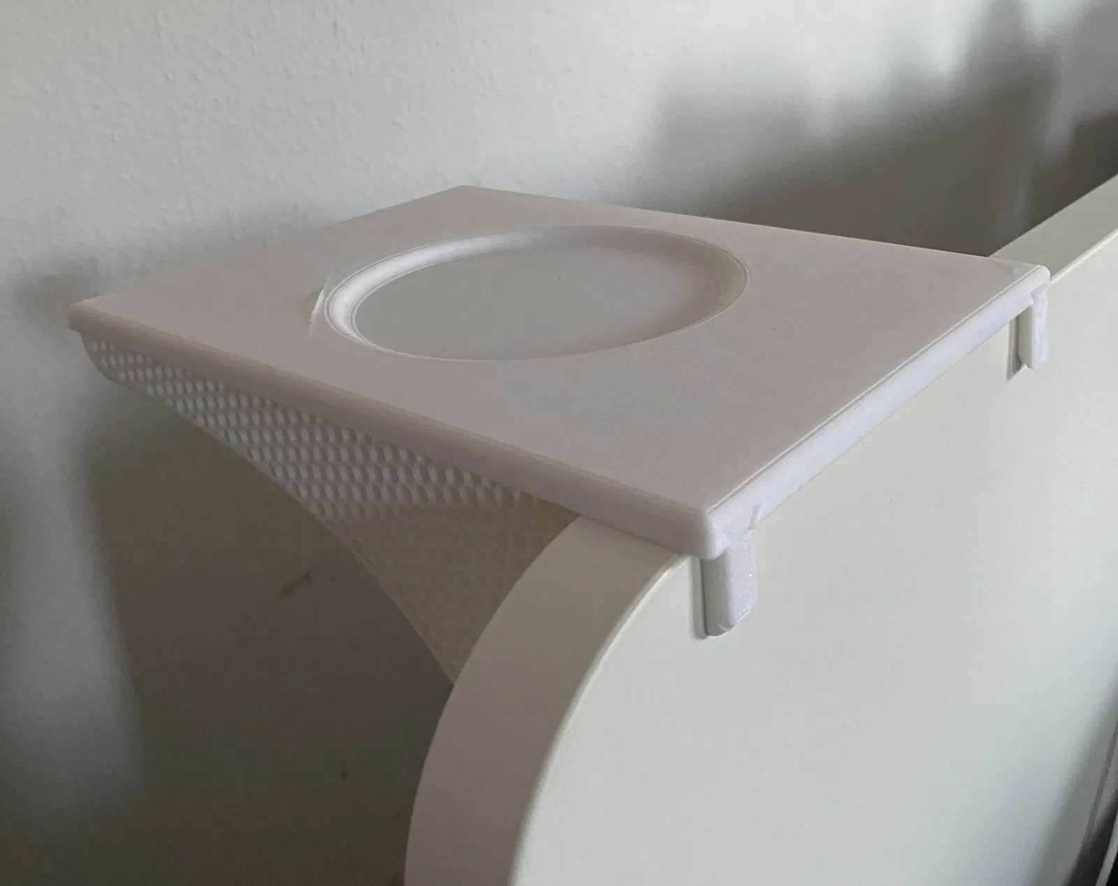 Bàn nhỏ này có thể gắn vô ván giường, với phần kẹp có thể điều chỉnh độ dày cho phù hợp. In bằng PLA, độ cao lớp in 0.28mm, phần ngàm in rỗng ruột với honeycomb infill.