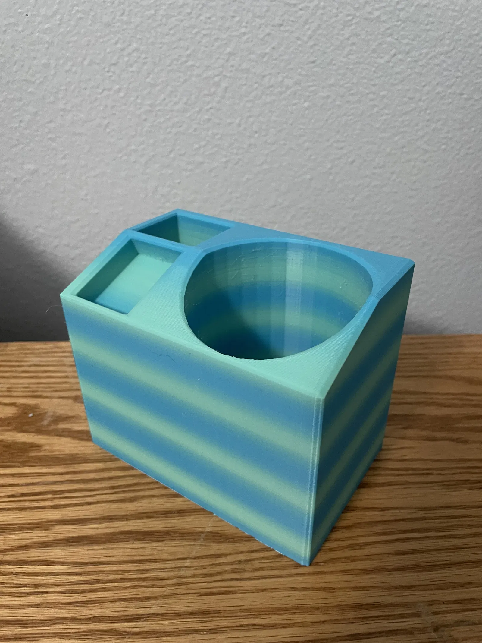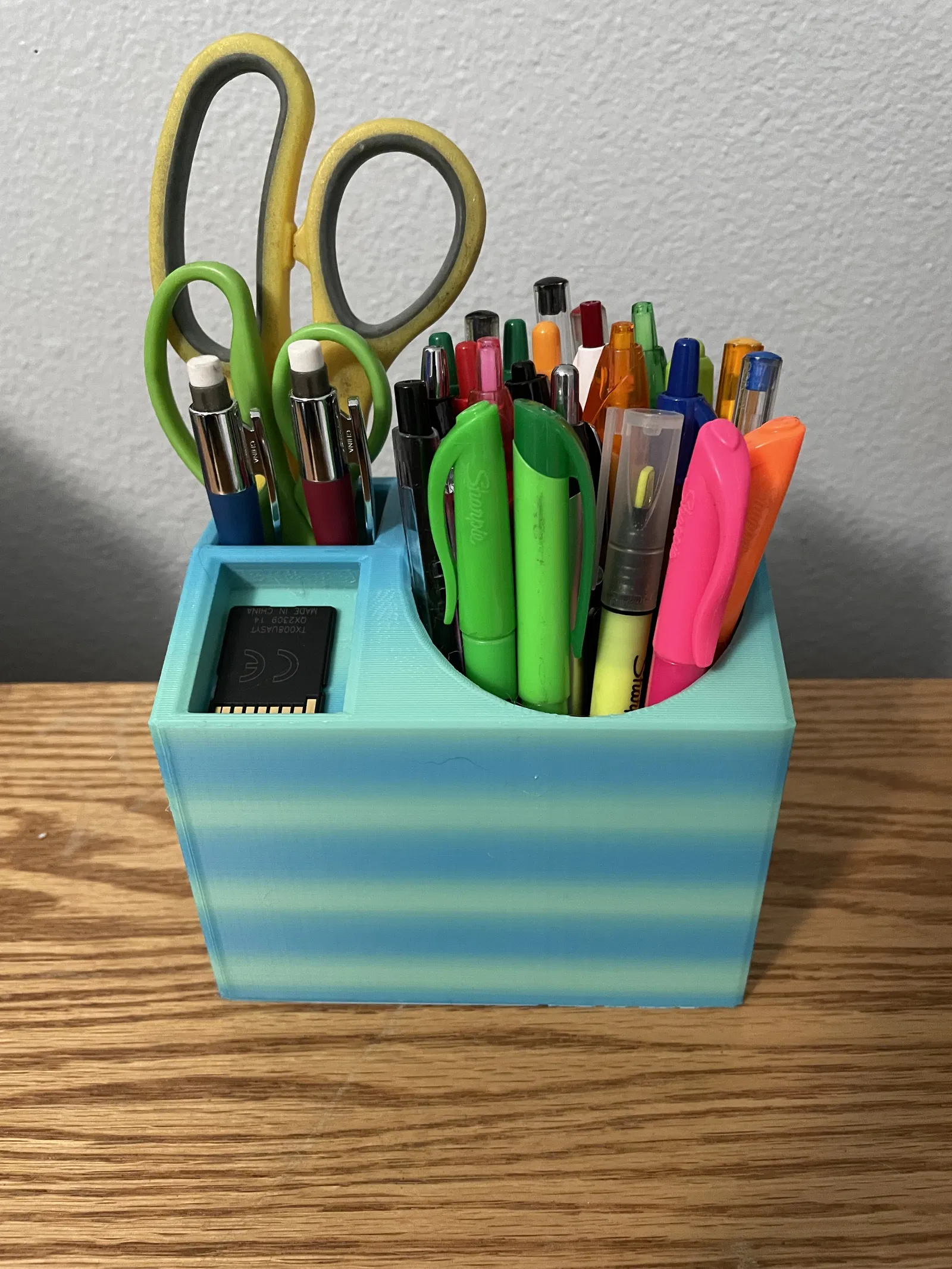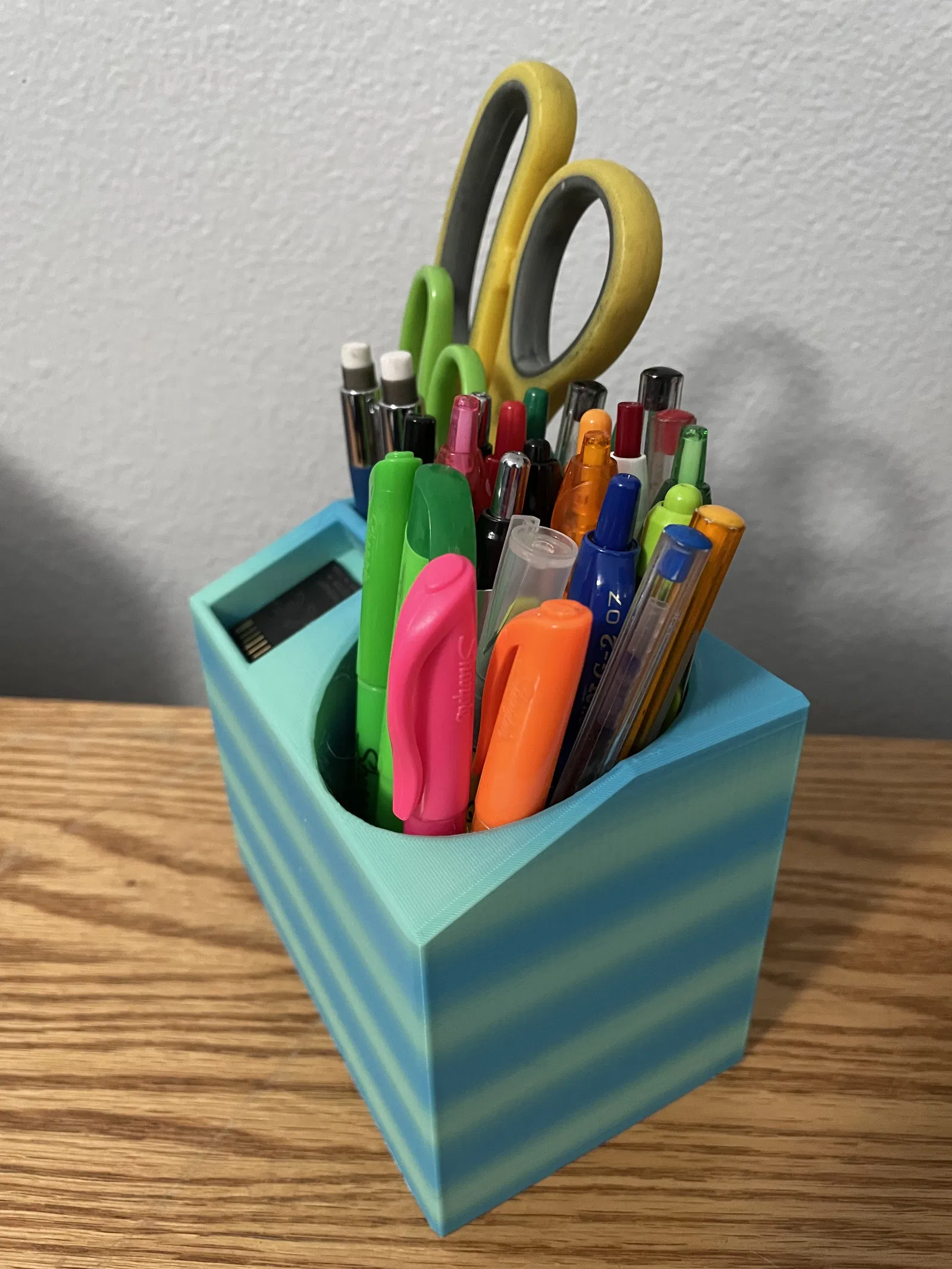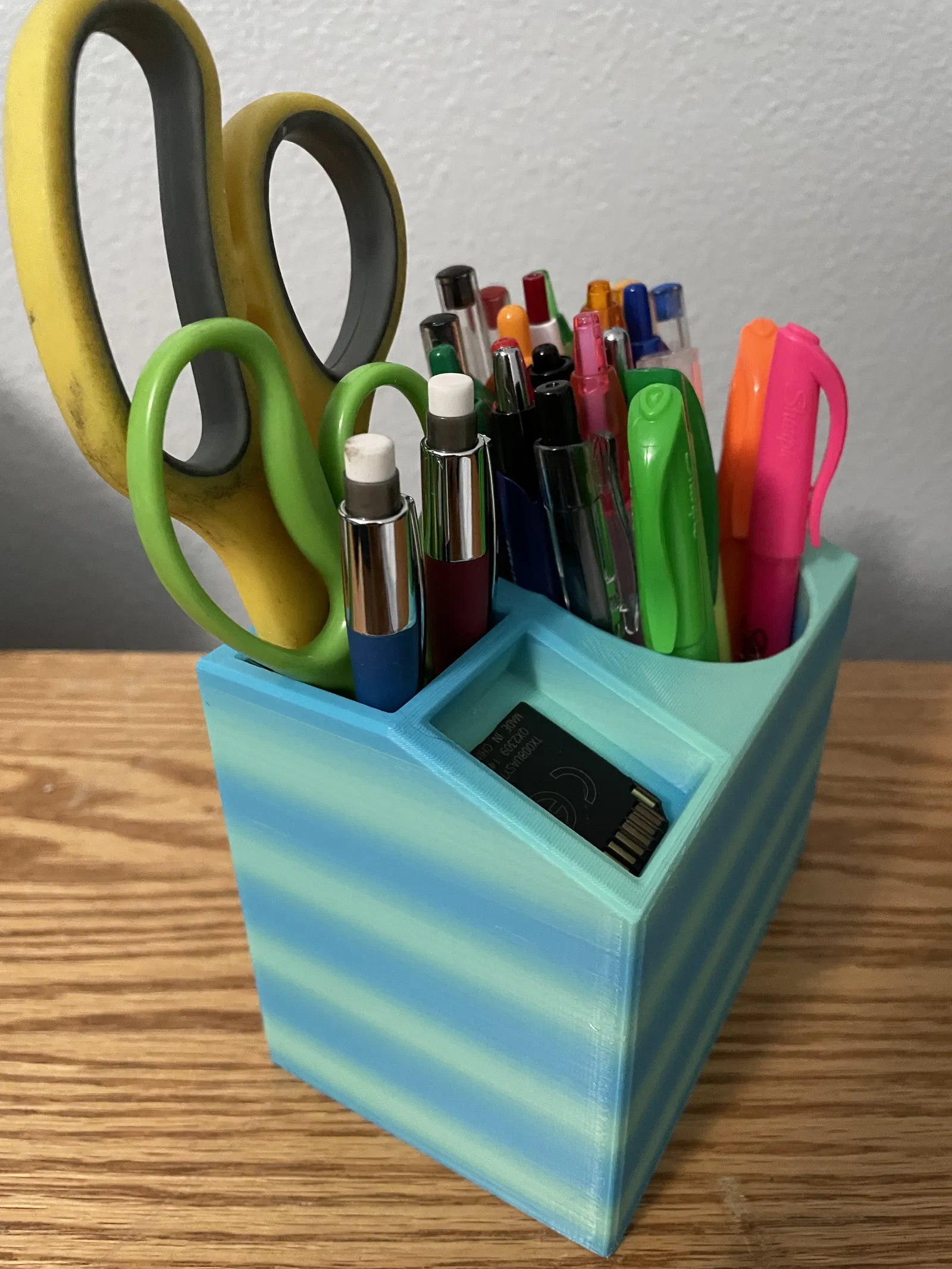 Kệ cắm bút lớn hơn V2 này được thiết kế để chứa nhiều vật dụng. Cài đặt được đề xuất bao gồm sử dụng brim, không cần supports, độ phân giải 0.2, infill 25% và sử dụng filament PLA màu đổi màu xanh và vàng.