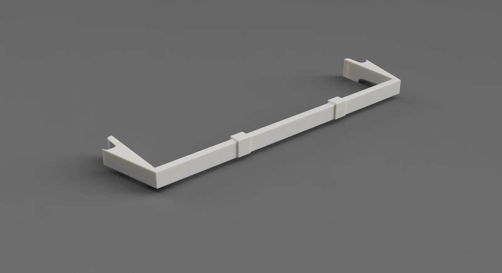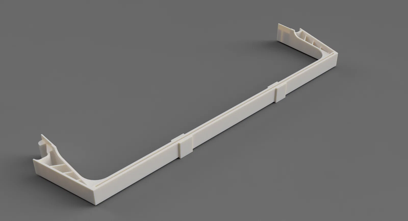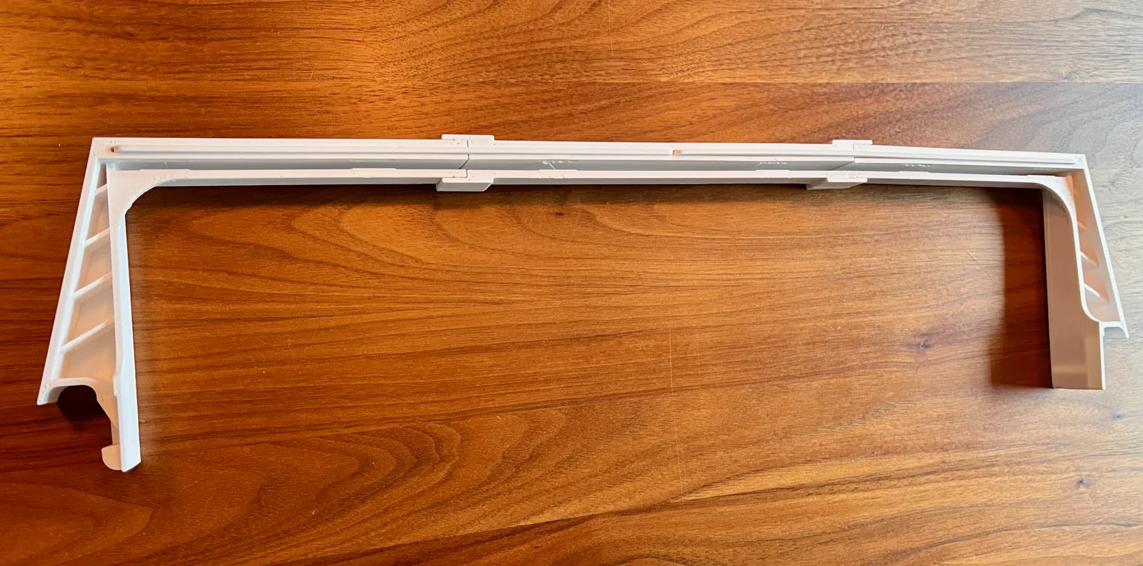 Thanh giữ chai của tủ lạnh Electrolux nhà mình (model IK24511RE) bị gãy, mà thấy giá đồ thay thế (hơn 40 CHF cả ship) nên mình quyết định tự thiết kế một thanh giữ chai thay thế đơn giản. Do nó dài quá, mình phải chia thanh giữ chai làm 3 mảnh, mảnh giữa có thể nhét từ trên xuống. Mình có thêm các chi tiết chèn vào để cố định 3 mảnh lại với nhau, cái này có thể dán keo vào khe tương ứng. Lưu ý: Các răng giữ cố định được lấy từ thanh giữ chai gốc, vì mấy cái đó chưa bị hư.