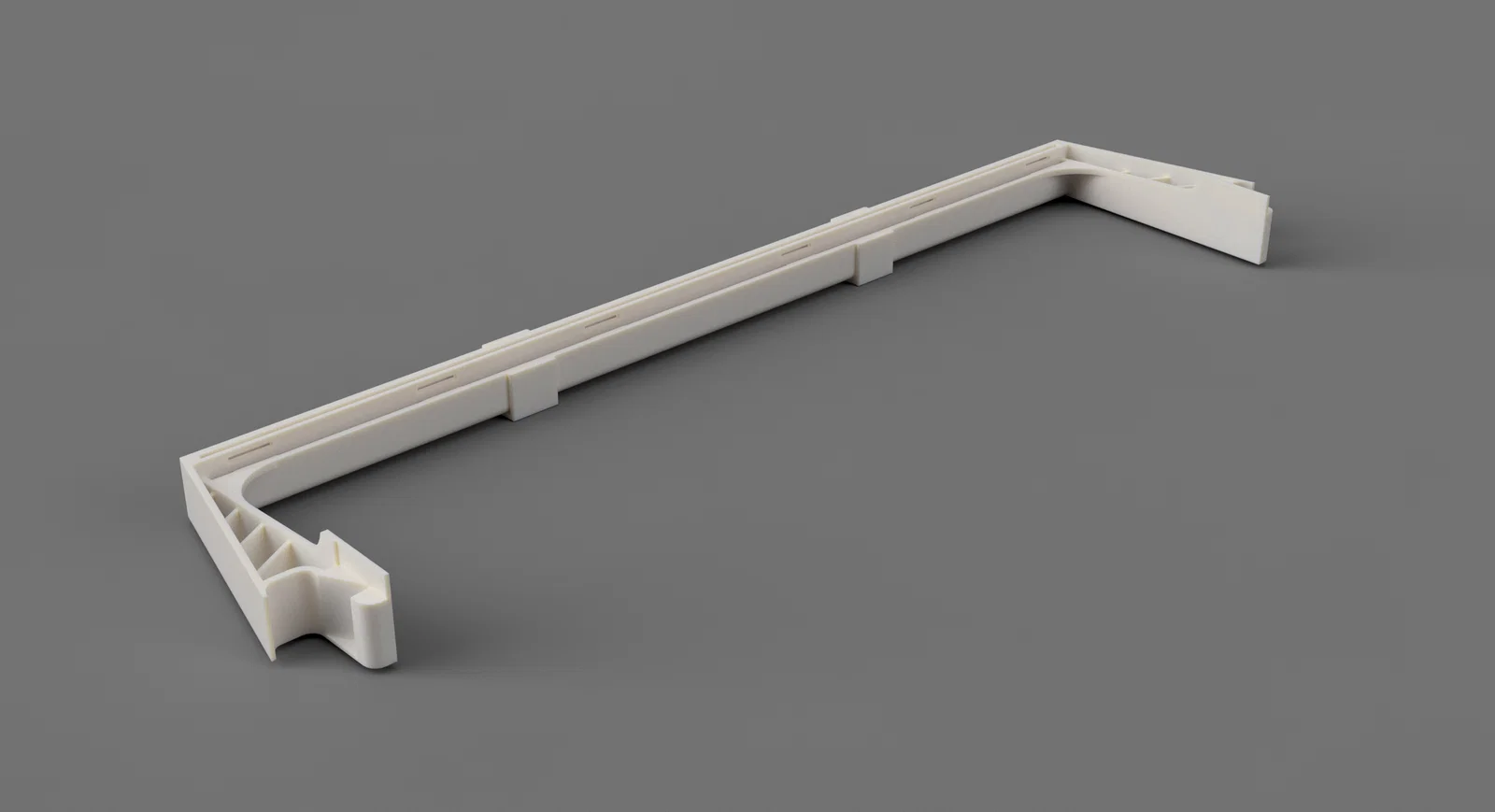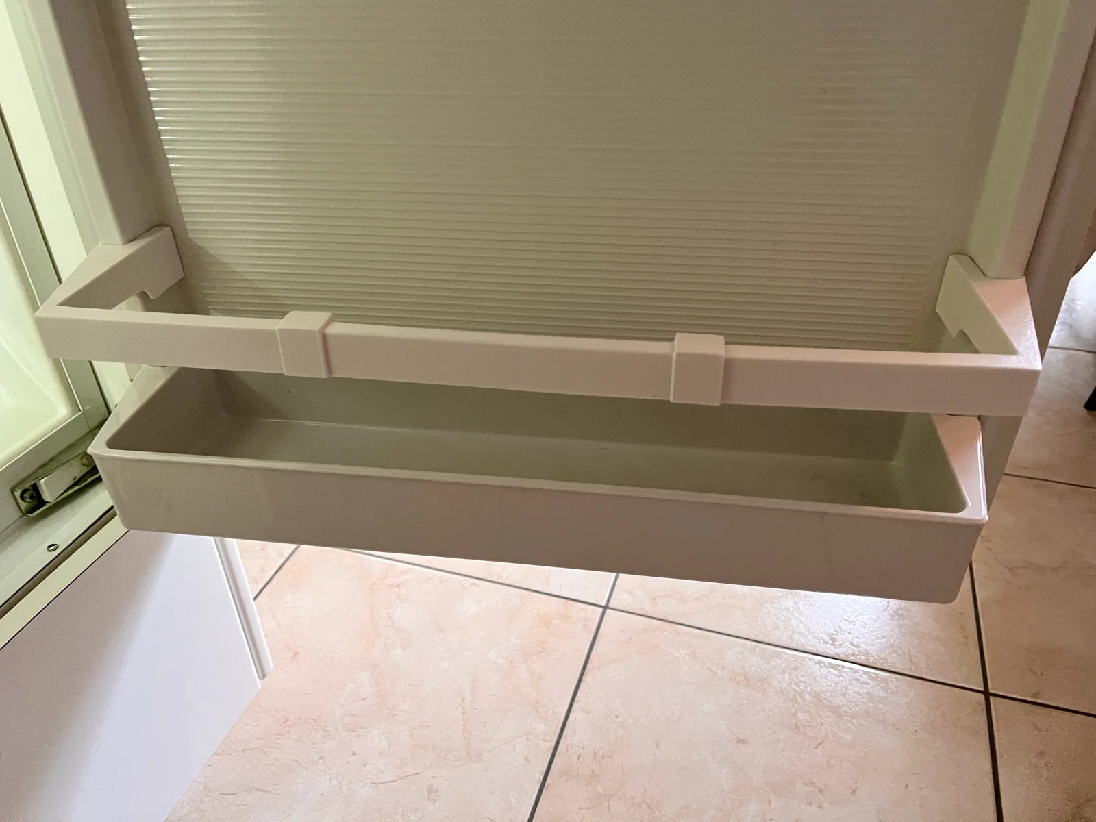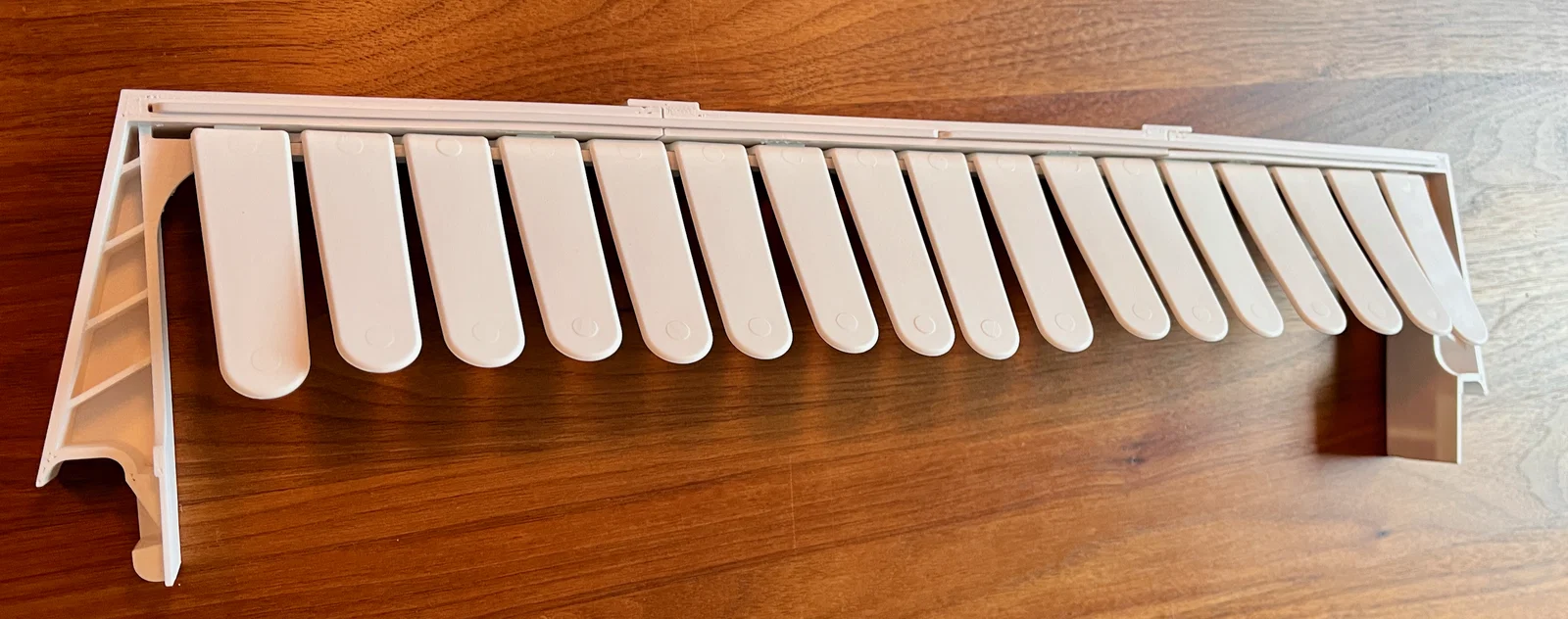 Thanh giữ chai của tủ lạnh Electrolux nhà mình (model IK24511RE) bị gãy, mà thấy giá đồ thay thế (hơn 40 CHF cả ship) nên mình quyết định tự thiết kế một thanh giữ chai thay thế đơn giản. Do nó dài quá, mình phải chia thanh giữ chai làm 3 mảnh, mảnh giữa có thể nhét từ trên xuống. Mình có thêm các chi tiết chèn vào để cố định 3 mảnh lại với nhau, cái này có thể dán keo vào khe tương ứng. Lưu ý: Các răng giữ cố định được lấy từ thanh giữ chai gốc, vì mấy cái đó chưa bị hư.