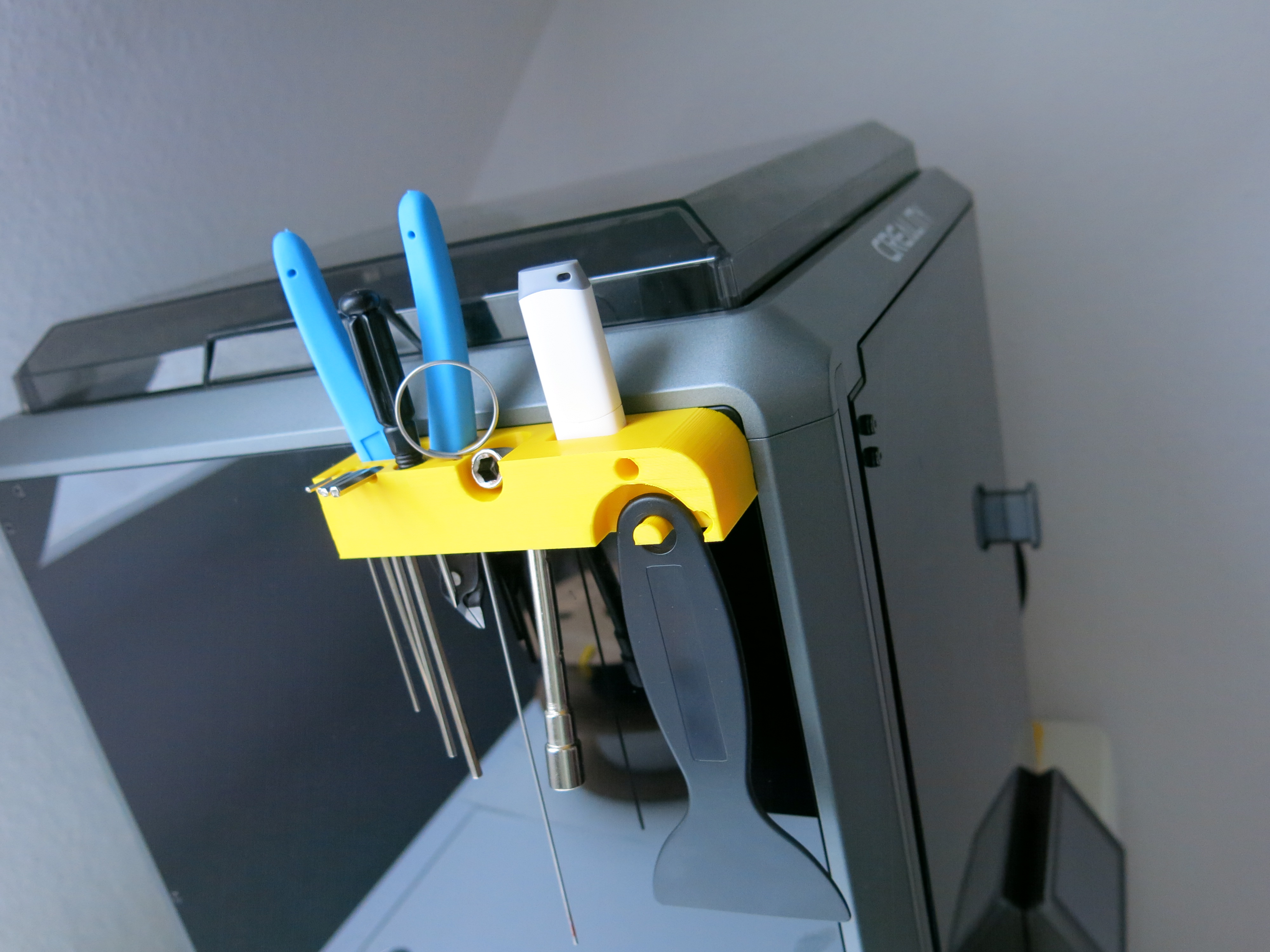 Giá đỡ dụng cụ gắn cố định cho máy in Creality K1, giúp cất giữ các dụng cụ và USB. Chỉ cần tháo hai ốc vít, dễ dàng lắp đặt. In bằng PLA, không cần support, autobrim, infill 15%. Sản phẩm này là giải pháp lưu trữ tiện lợi, giữ cho các vật dụng cần thiết luôn sẵn sàng và gọn gàng trên máy in của bạn.