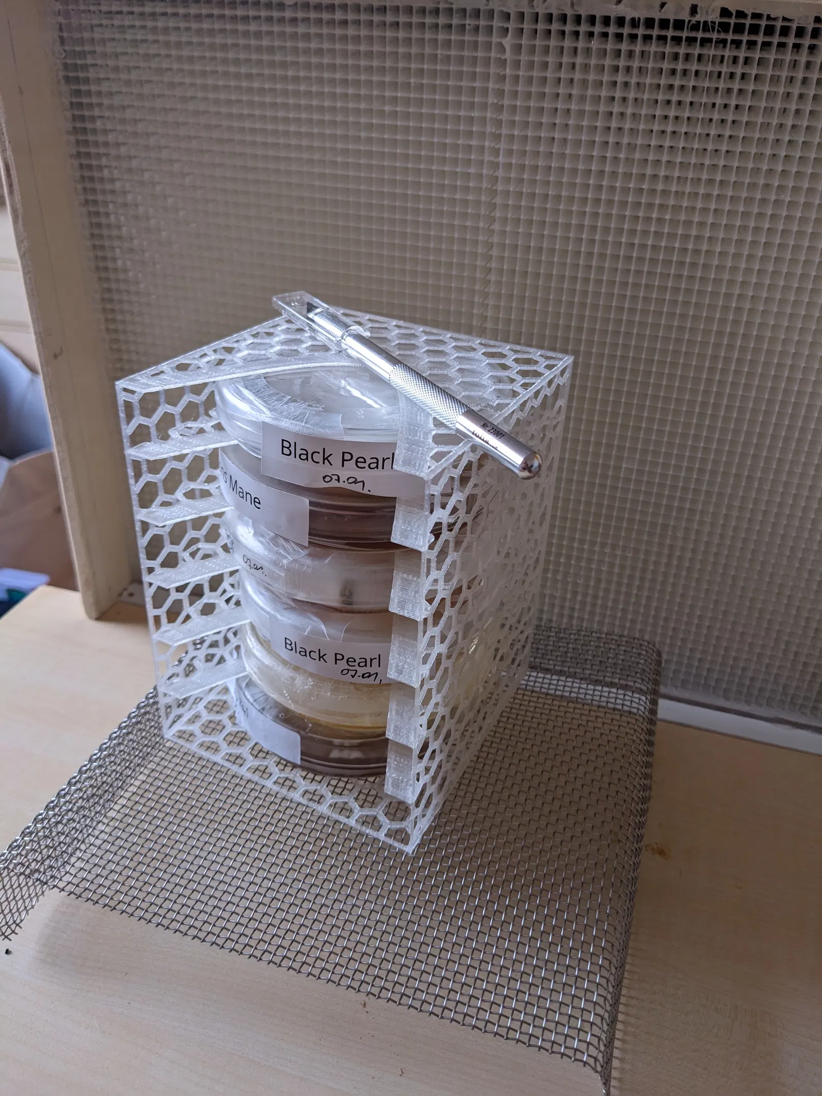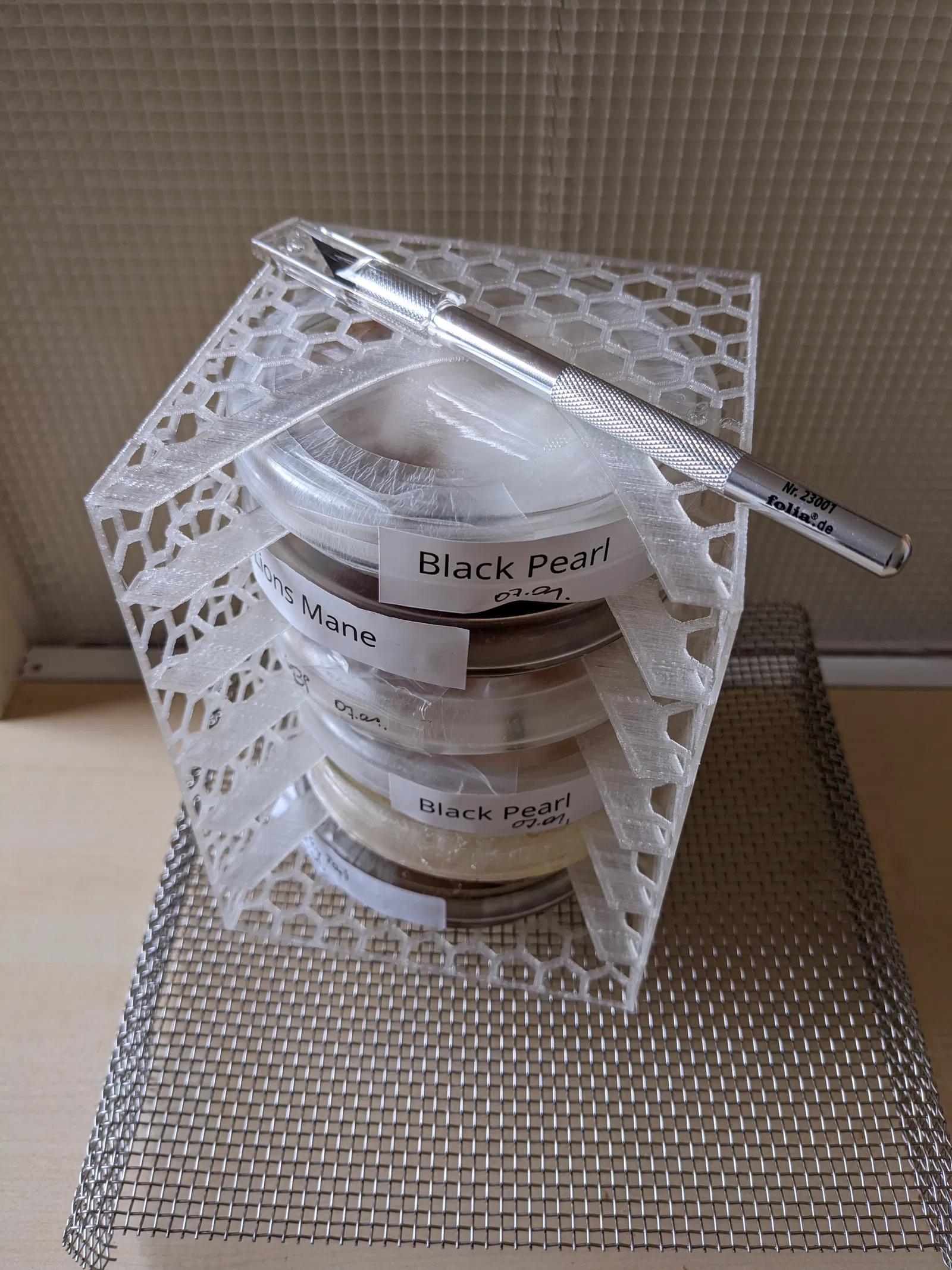 Giá đỡ đĩa petri 100 mm này được thiết kế dạng lưới lục giác giúp tiết kiệm vật liệu, chỉ nặng 30-50 gram. Có bản tối giản và bản gia cố, phù hợp cho các thí nghiệm sinh học và nuôi cấy.