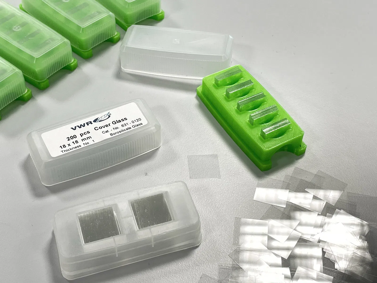 Một số hộp đựng lam kính thường làm vương vãi lam kính không mong muốn, và lãng phí rất nhiều. Do đó, đây là sản phẩm thay thế. Loại có năm khe thì lý tưởng nếu sinh viên tự thao tác với lam kính (Hộp đựng lam kính.stl).