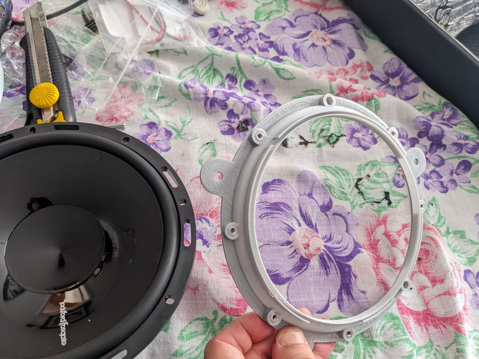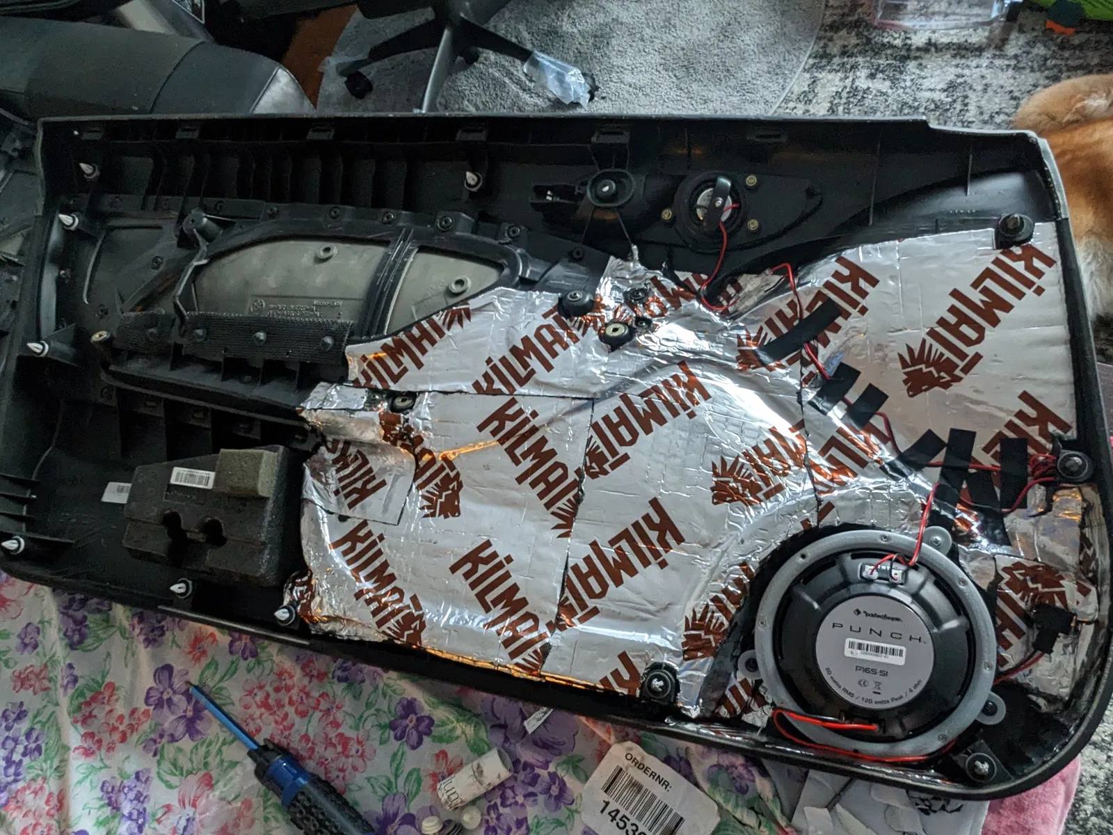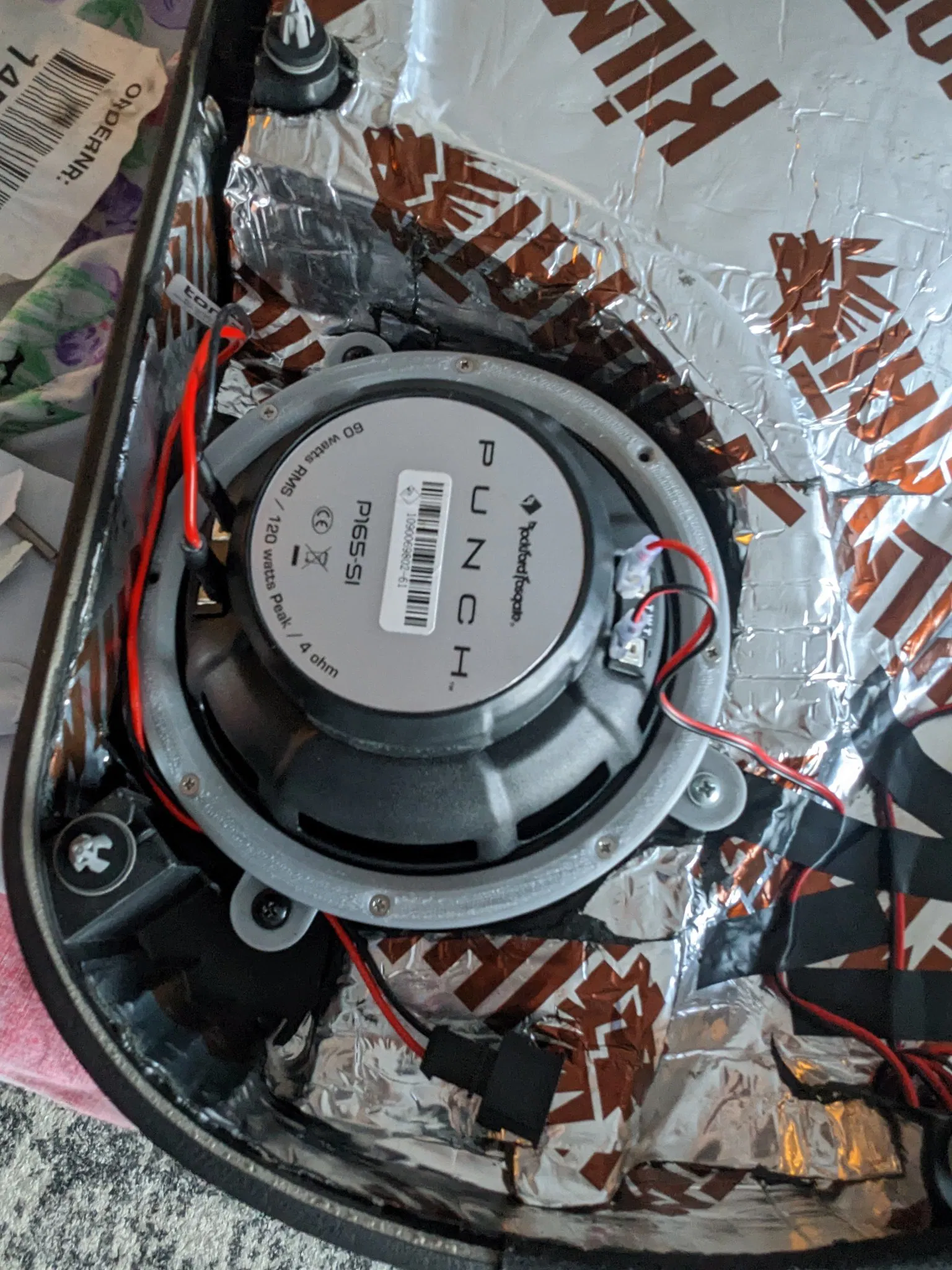 Sau khi in chúng, tôi đã mài các giá đỡ loa trung (nơi tôi đã sử dụng hỗ trợ in), đặt foam cách âm lên các giá đỡ, lắp đặt vật liệu giảm âm trên cửa và lắp đặt các loa mới vào xe với các đầu nối mà tôi tìm thấy trên Amazon (mà tôi đã phải sửa đổi từ phía loa vì các đầu nối RockFord Fosgate rộng hơn 1 kích cỡ).