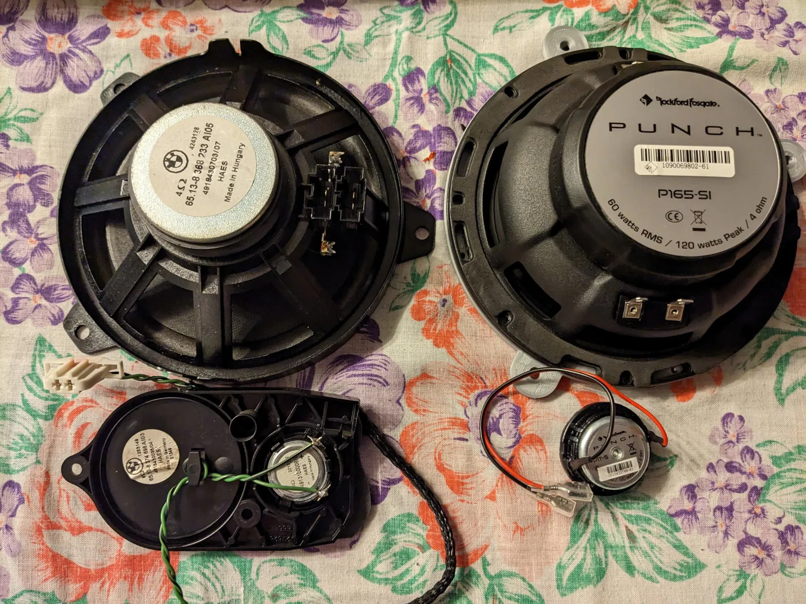 Lựa chọn loa của tôi rơi vào RockFord Fosgate Punch Series P165-SI (sau khi nghe nhiều mẫu loa trên crutchfield.com). Bộ P165-SI bao gồm một loa trung 165mm (6.5") và một loa tweeter 44mm, mà không cần phải thay đổi gì trong xe (để tôi có thể quay về cấu hình ban đầu khi bán xe),