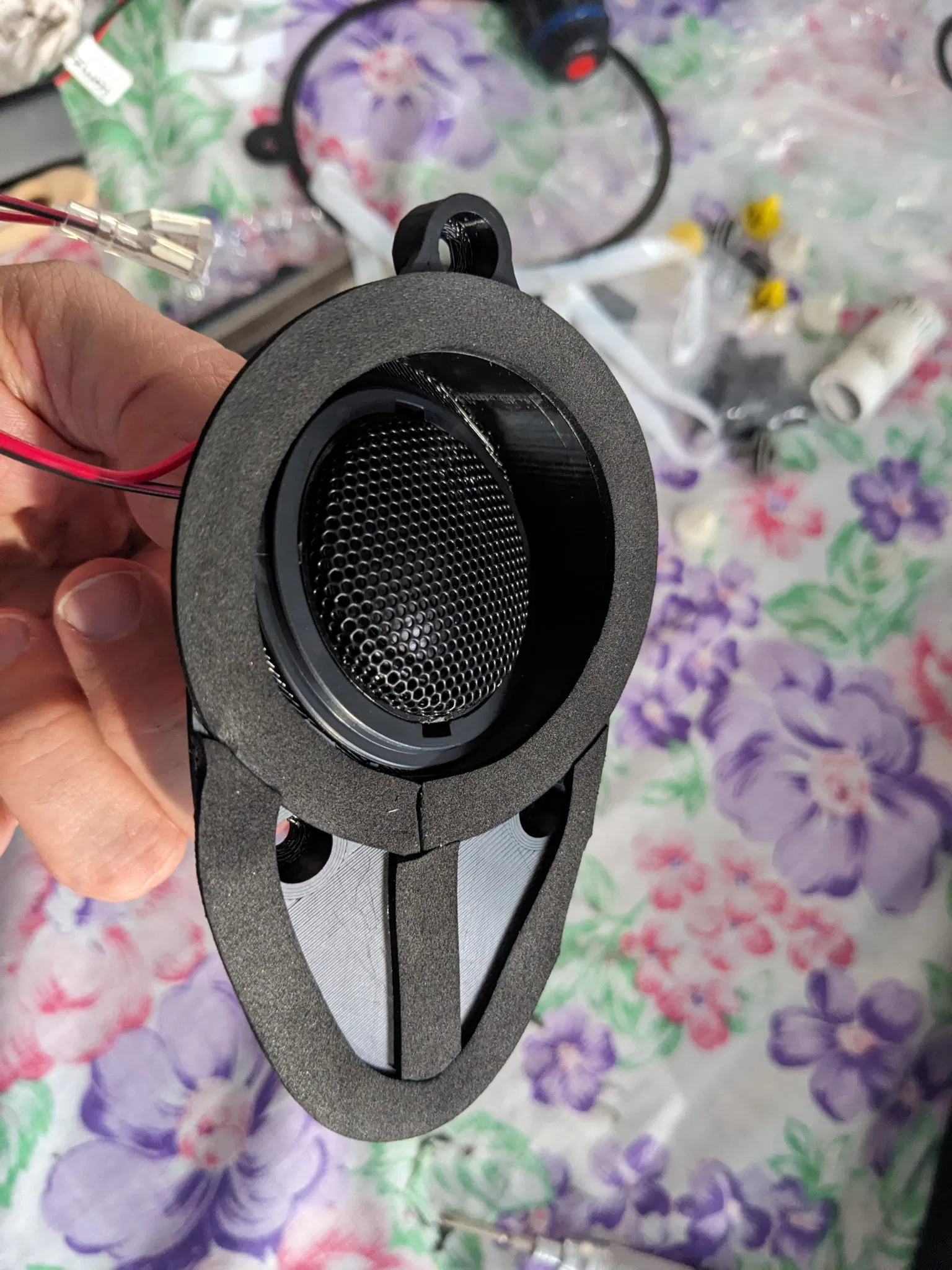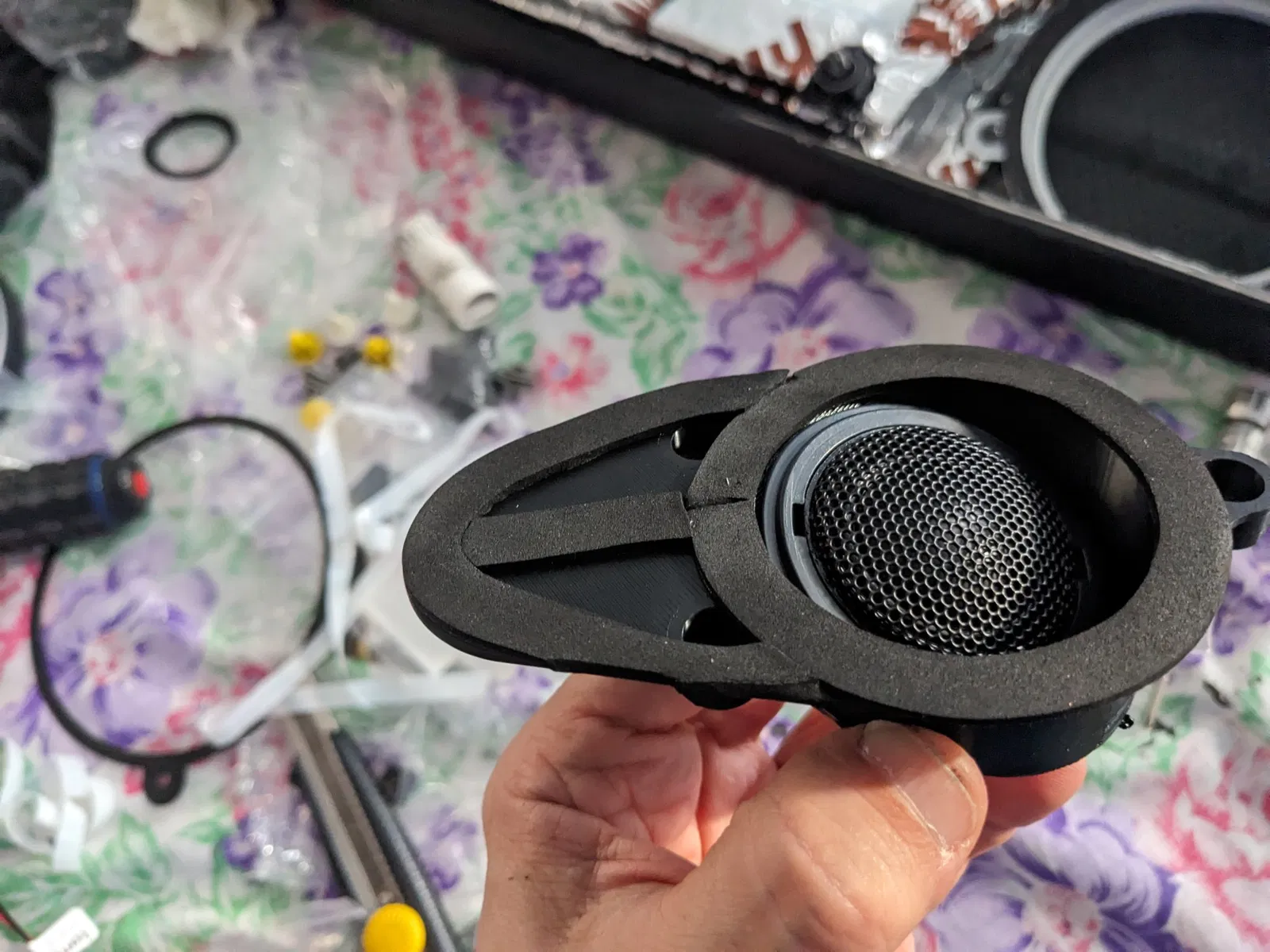 - Âm thanh của loa tweeter là hướng và hầu hết các bộ chuyển đổi tôi tìm thấy trực tuyến đều phẳng với cửa (không hướng về đầu tài xế và hành khách), vì vậy tôi tạo một giá đỡ với góc 10º hướng lên và 25º hướng vào trong (các góc được ước lượng bằng mắt)