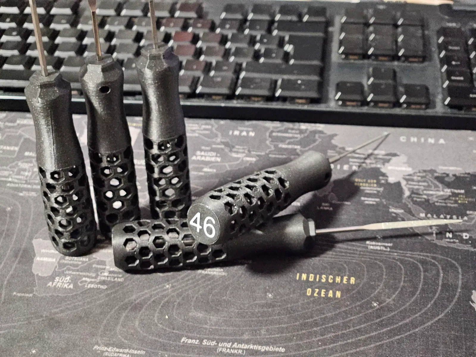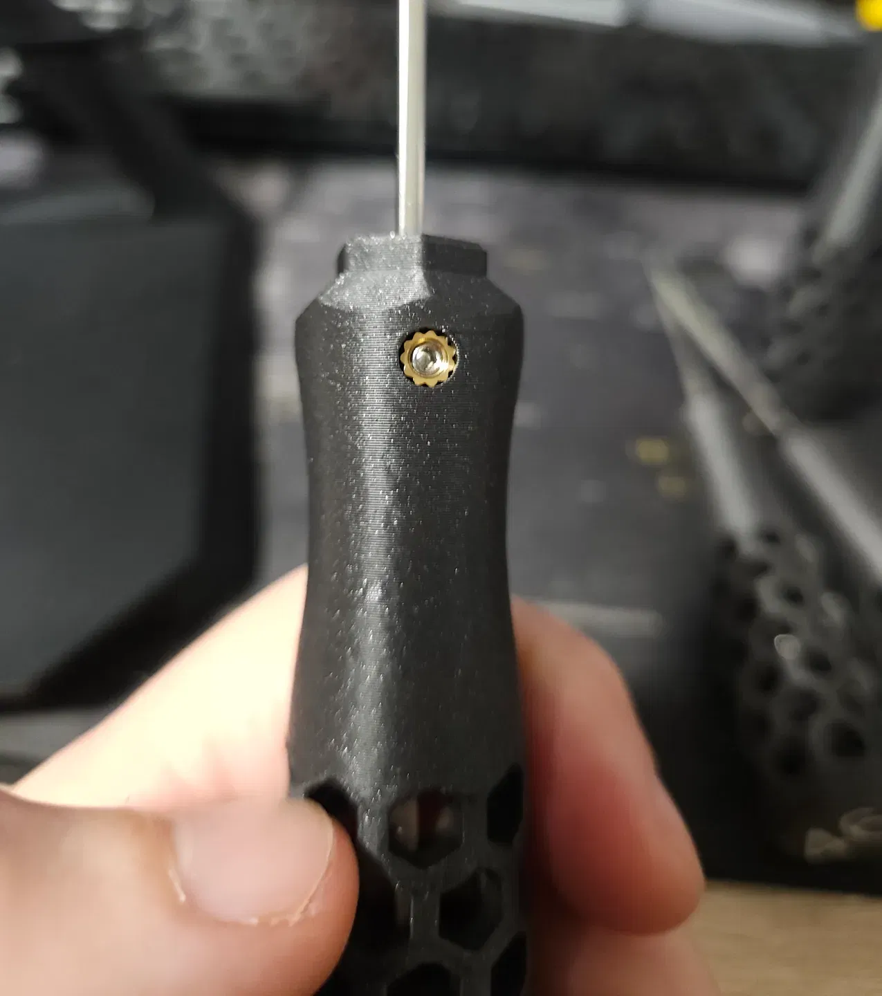 Tay cầm công cụ này dùng cho thanh vuông 2,5 mm x 2,5 mm. Nó sử dụng ốc định nhiệt M3 và ốc lục giác M3 x 8mm để cố định, rất tiện lợi cho anh em cần thay đổi hoặc sửa chữa các dụng cụ nhỏ.