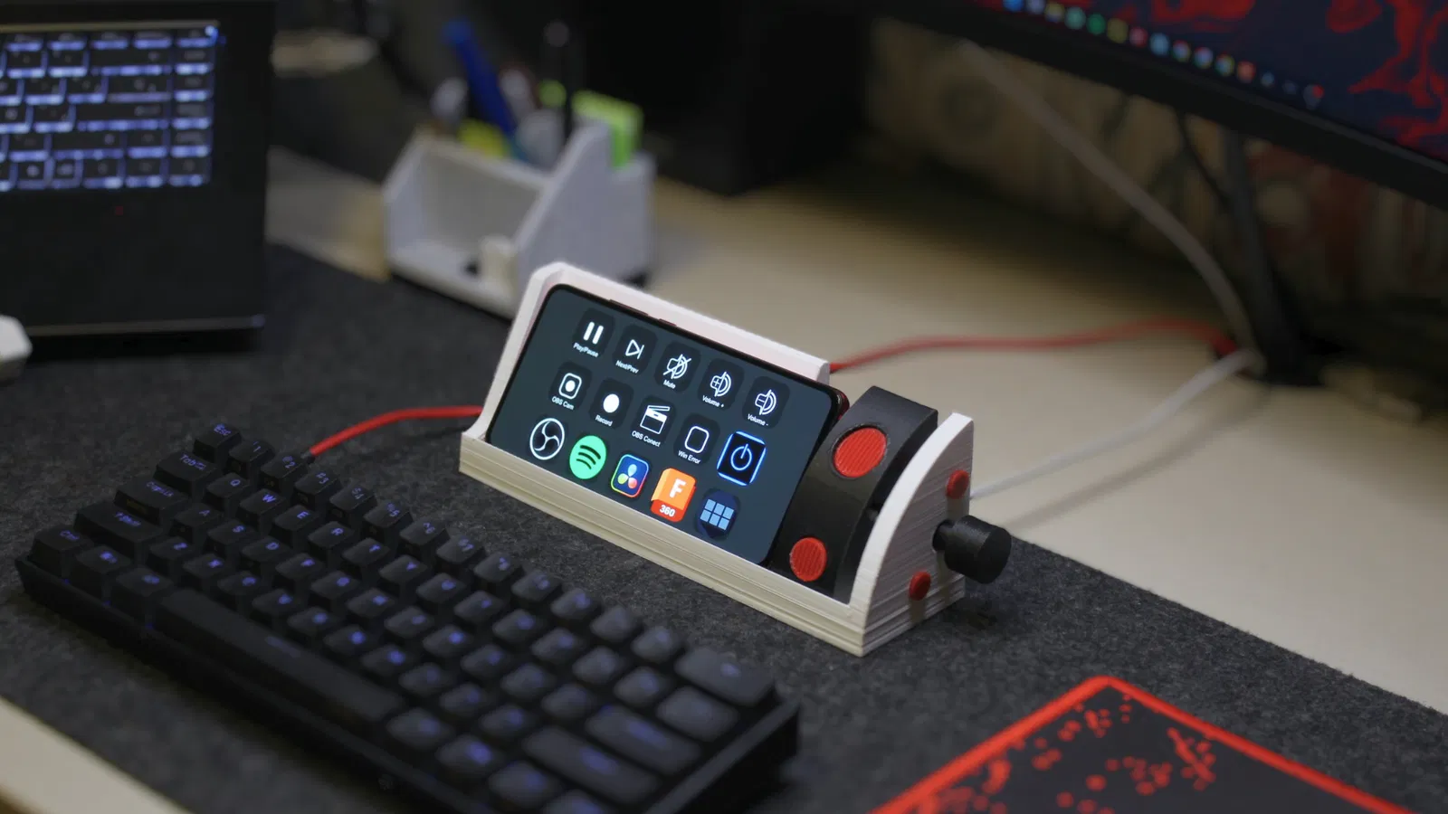 Thiết kế để đỡ mọi loại điện thoại, với ý tưởng ban đầu là dùng như một Stream Deck miễn phí. Cái này để giữ điện thoại ngang, ai cũng xài được hết trơn.