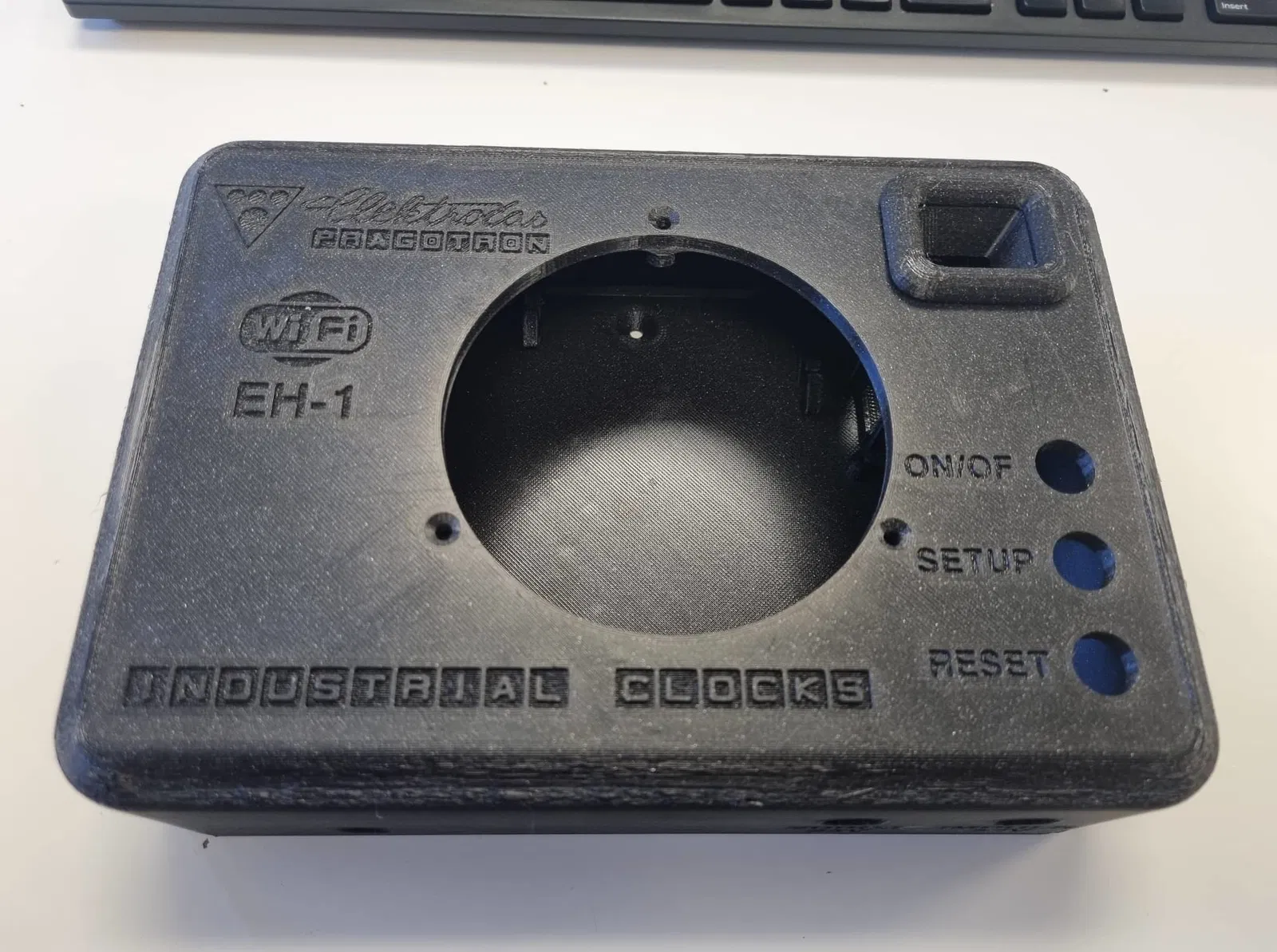 Hộp in 3D này dùng để đựng bộ tạo xung cho các loại đồng hồ Pragotron, Elektročas và IBM. Hộp được làm từ PETG, yêu cầu 350g vật liệu và điền đầy. Nguồn điện là 24V từ bên ngoài. Các linh kiện điện tử được cấp nguồn bằng bộ chuyển đổi DC/DC 24-5V. Đồng hồ điều khiển Elektročas KH-1 được gắn ở phía trên.