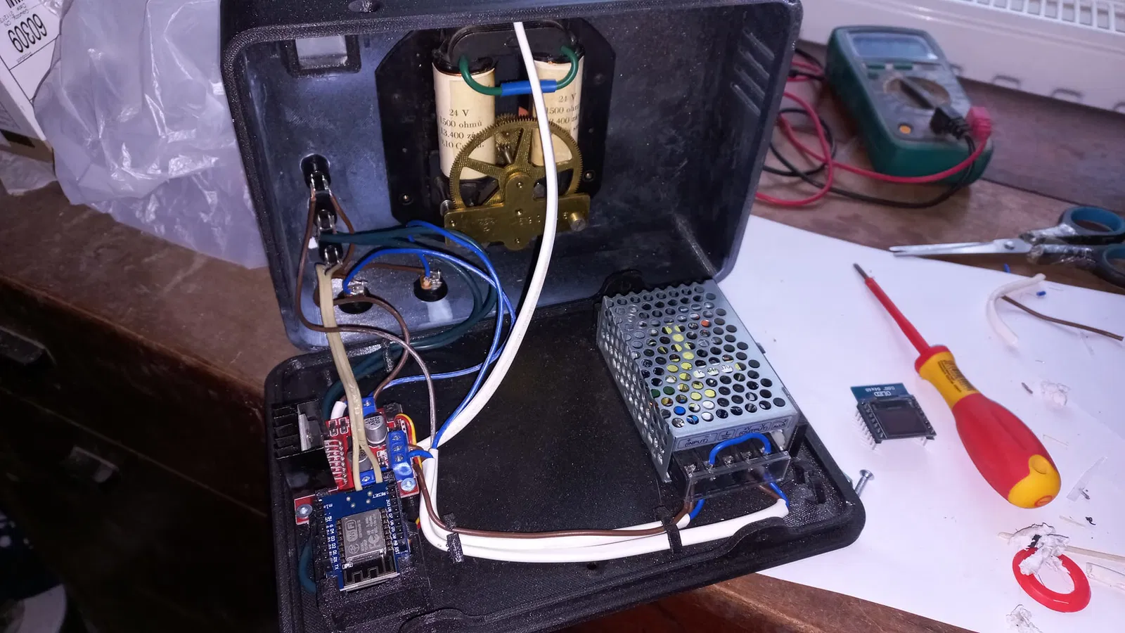 - Các linh kiện điện tử được cấp nguồn bởi bộ chuyển đổi DC/DC 24-5V Mean Well SD-15A-5. Nó được giữ tại chỗ bằng 2 vít M3x10