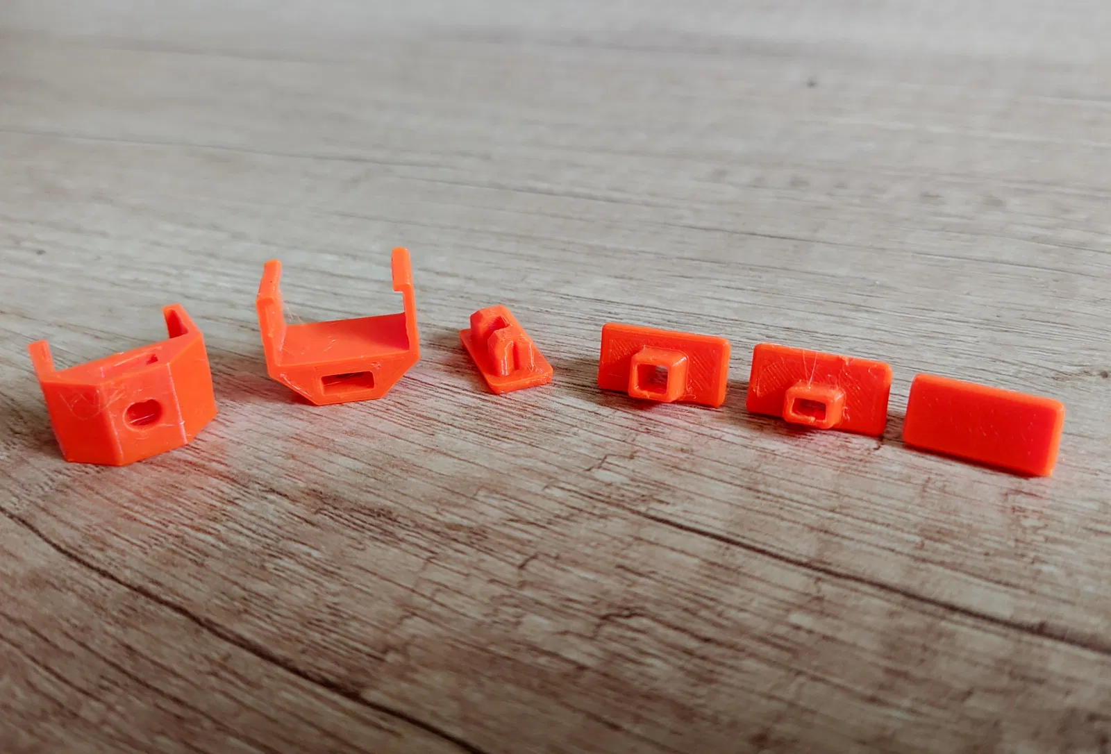 Mấy cái pát kẹp này làm cho thanh nhôm loại 14x7mm (như trong hình) và cần ốc M3 với đai ốc vuông để gắn vô khung. In bằng PETG thì nó đủ dẻo để kẹp thanh đèn vô dễ dàng mà vẫn giữ chắc không bị tuột. Tui cũng có làm thêm ba loại nắp bịt cho thanh nhôm: một cái cho một đầu nối, một cái cho hai đầu nối và một cái bịt kín. Nếu bạn cũng muốn dùng ống co nhiệt để giảm lực kéo như tui nè, thì dùng trục của mỏ hàn để hơ nóng nha, súng hơi nóng nó làm biến dạng cái PETG lẹ lắm luôn.