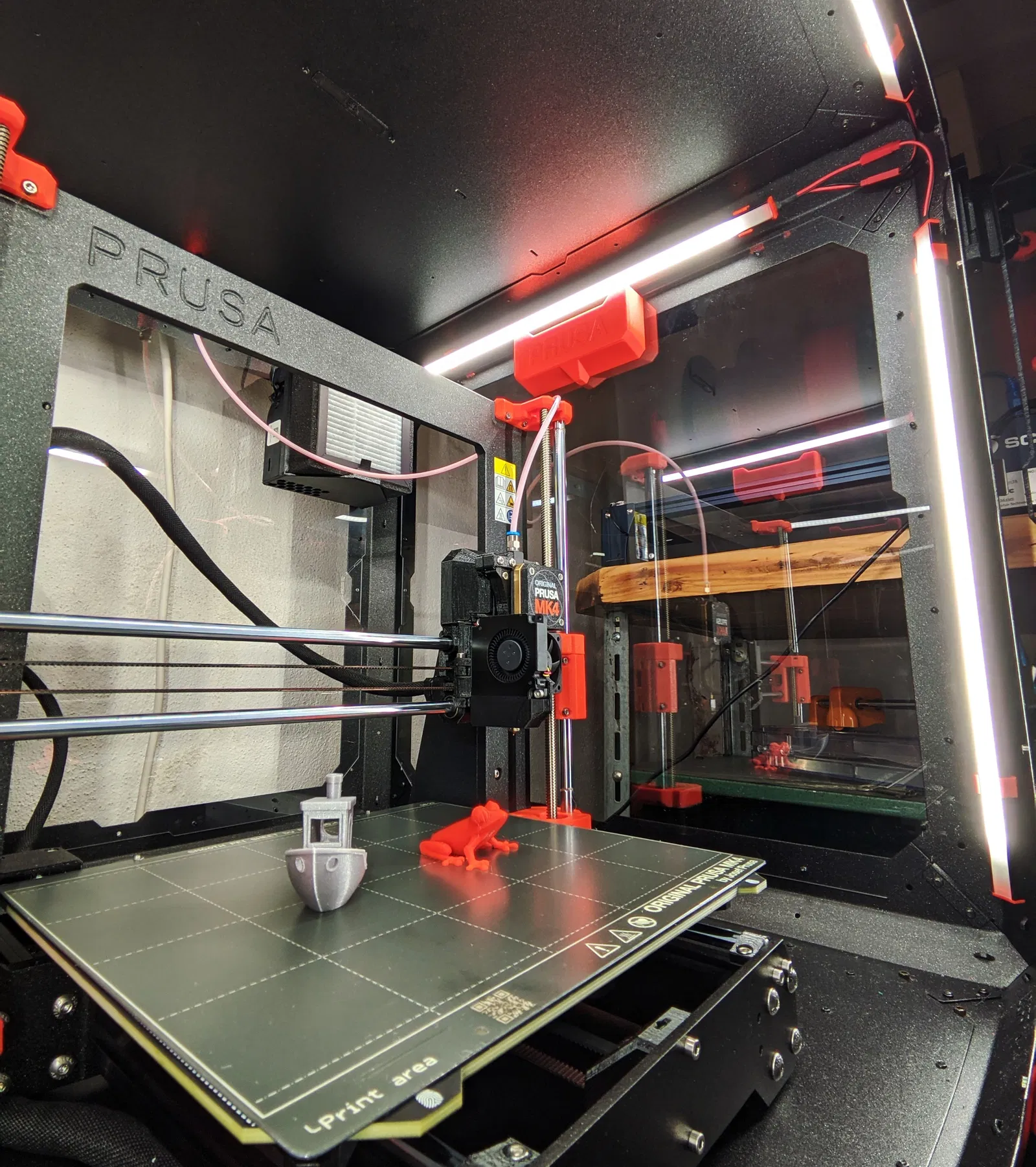 Tui thấy dây đèn LED của Prusa bán mắc quá nên tui tự chế pát kẹp để gắn dây đèn LED 24V với thanh nhôm vô Prusa Enclosure. Ánh sáng giờ mạnh lắm, in đồ đẹp mà không tốn điện.