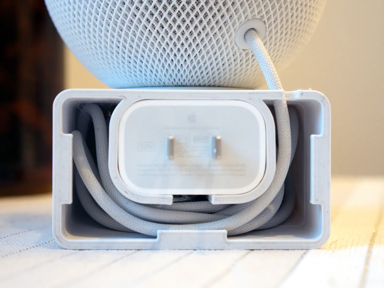 Khe cắm phích cắm giờ được đặt ở phía trên của mô hình, thay đổi điểm tựa. Điều này sẽ giảm khả năng HomePod Mini bị nghiêng ra khỏi tường do trọng lượng.