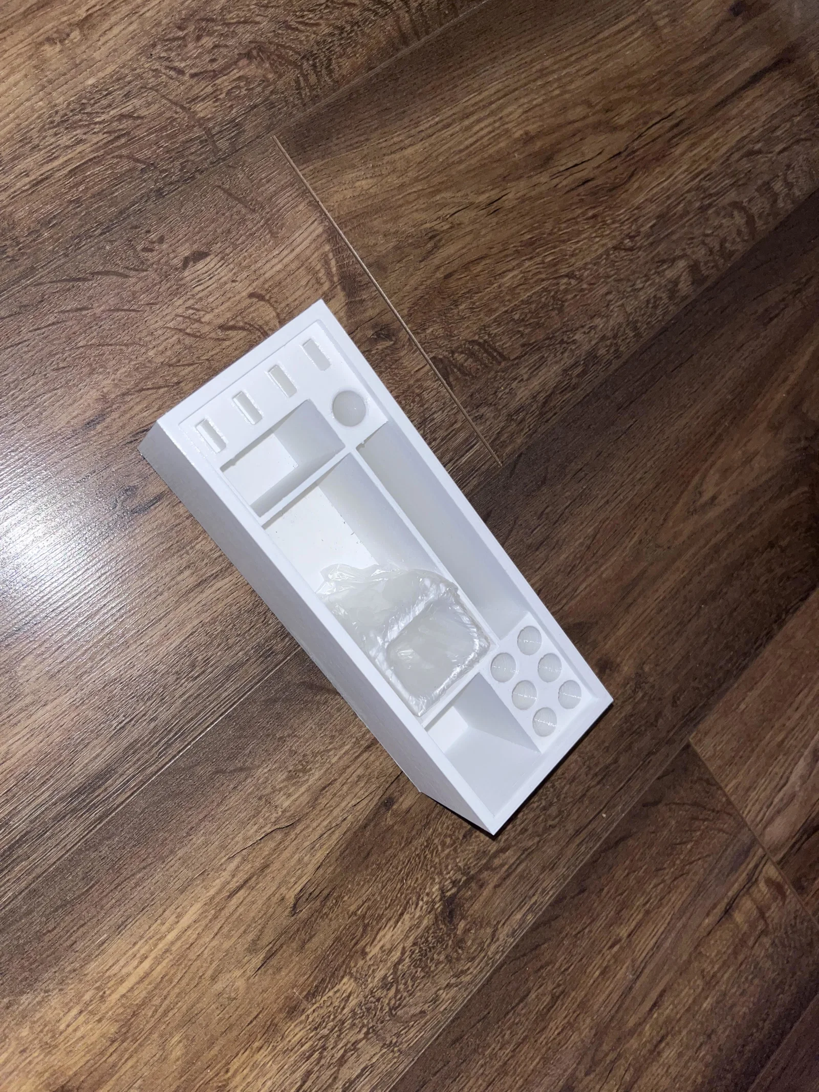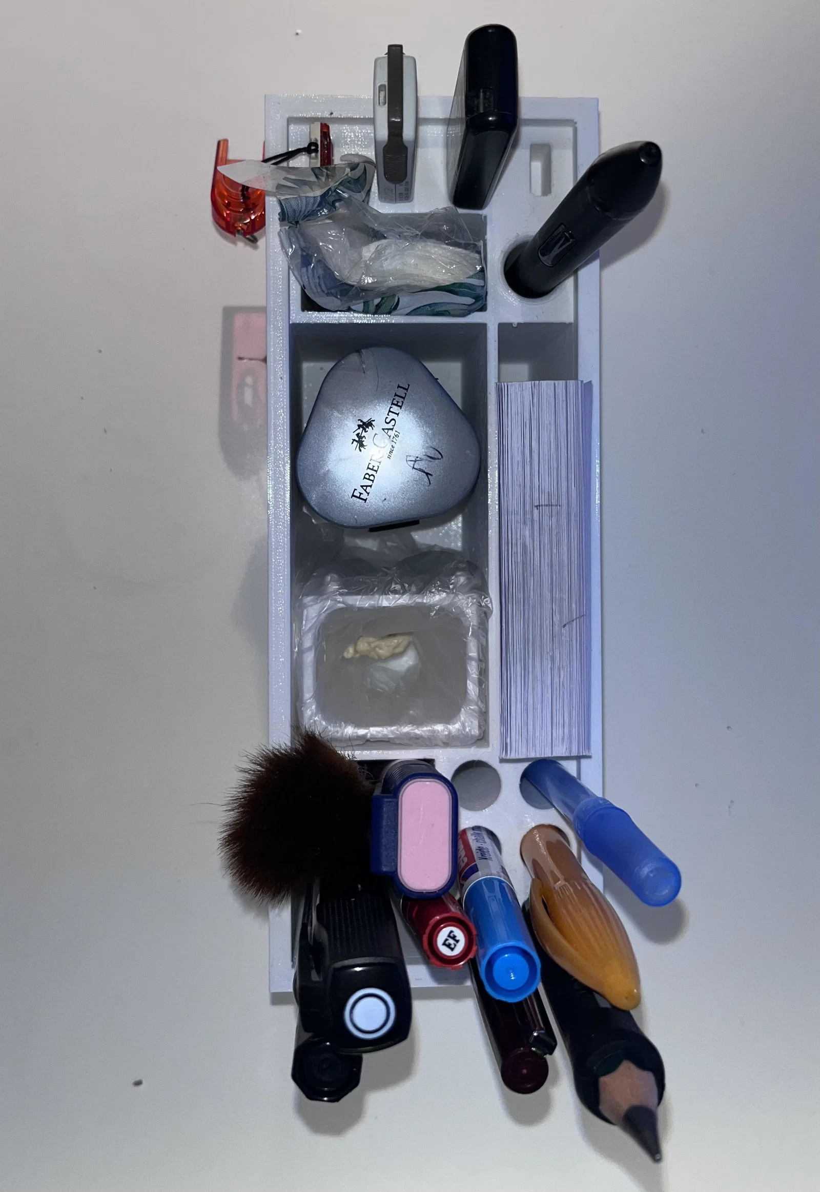 Đây là một cái khay đựng đồ có lỗ cắm USB để cất giữ USB, bút và có thêm một thùng rác nhỏ để đựng kẹo cao su.