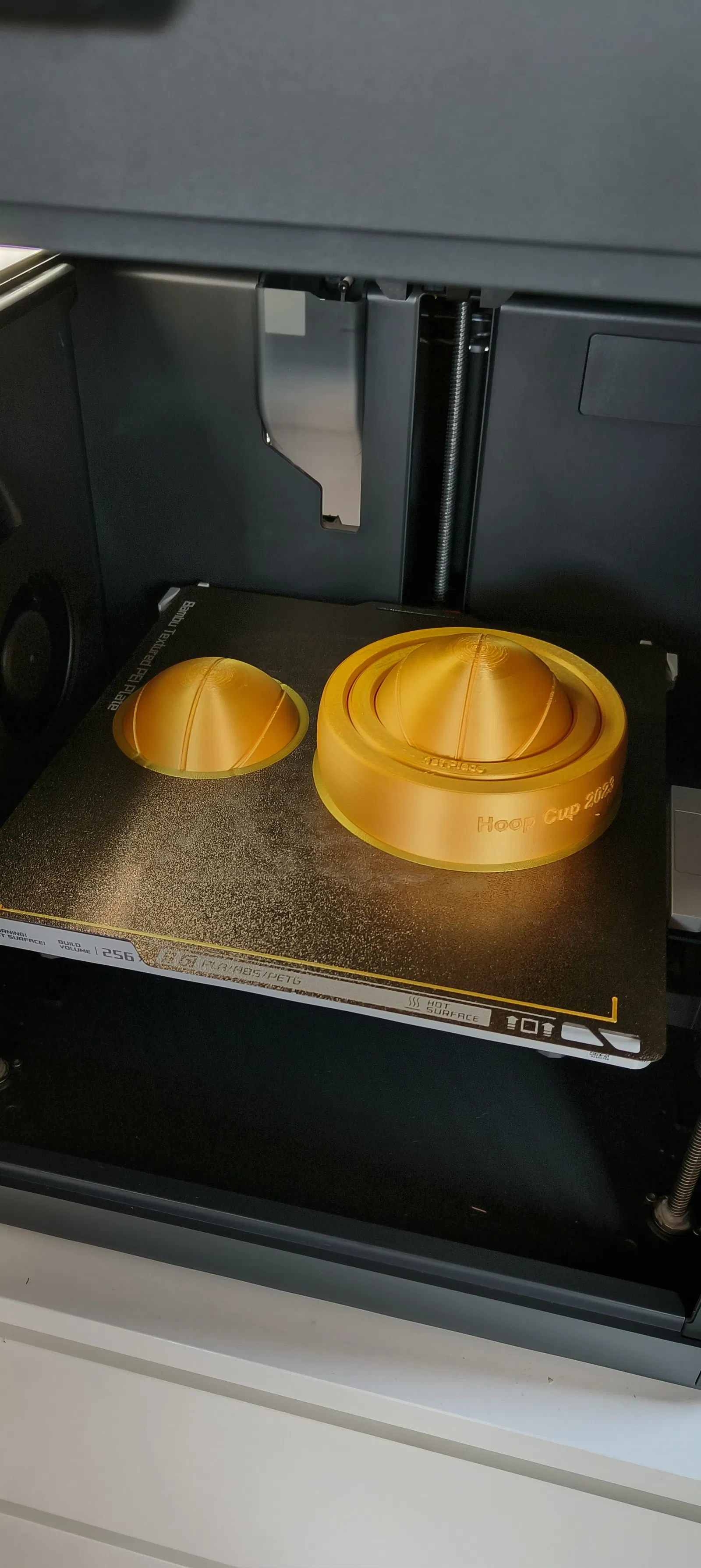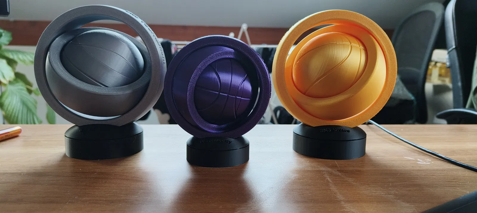 Cúp độc đáo cho giải bóng rổ 3x3, chế lại từ đồ chơi vòng xoay. Hai vòng tròn xoay quanh trái bóng rổ, đế vững chắc. In trái bóng 2 mảnh để dễ dàng và hạn chế support. Chất liệu PLA cao cấp.