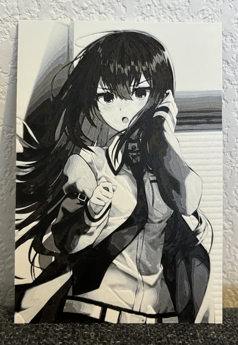 Lần đầu thử nghiệm với HueForge, tui giới thiệu mô hình Kurisu Makise từ Steins;Gate. Yêu cầu AMS hoặc tương đương. Hướng dẫn in chi tiết và đổi màu vật liệu đã được cung cấp.