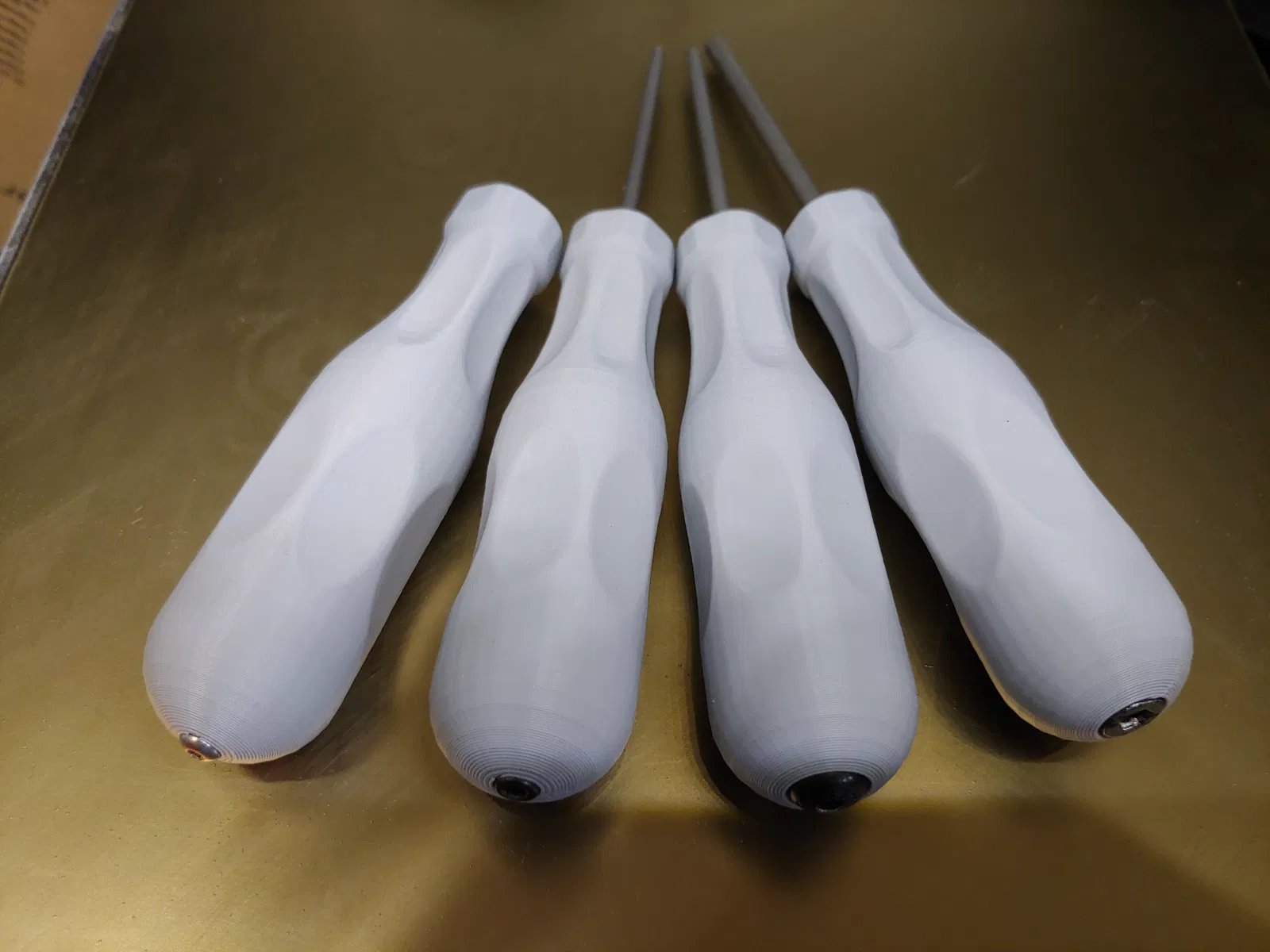 Những tay cầm này dựa vào việc ép chặt để giữ đầu vít. Chúng không được thiết kế để tháo ra và lắp lại nhiều lần. Nhiều yếu tố có thể ảnh hưởng đến độ vừa của đầu vít, bao gồm loại sợi in, chiều cao lớp, & làm mát. Tôi đã in chúng bằng Polymaker ASA với chiều cao lớp 0.2mm. PLA+ có lẽ sẽ cần co lại khoảng 98%+/- trong slicer vì PLA không co lại nhiều bằng. Hủy lệnh in sau khi phần đầu tiên được in xong, kiểm tra độ vừa, & điều chỉnh. Một khi đã vừa, tất cả các tay cầm có thể in ở cùng một tỷ lệ.