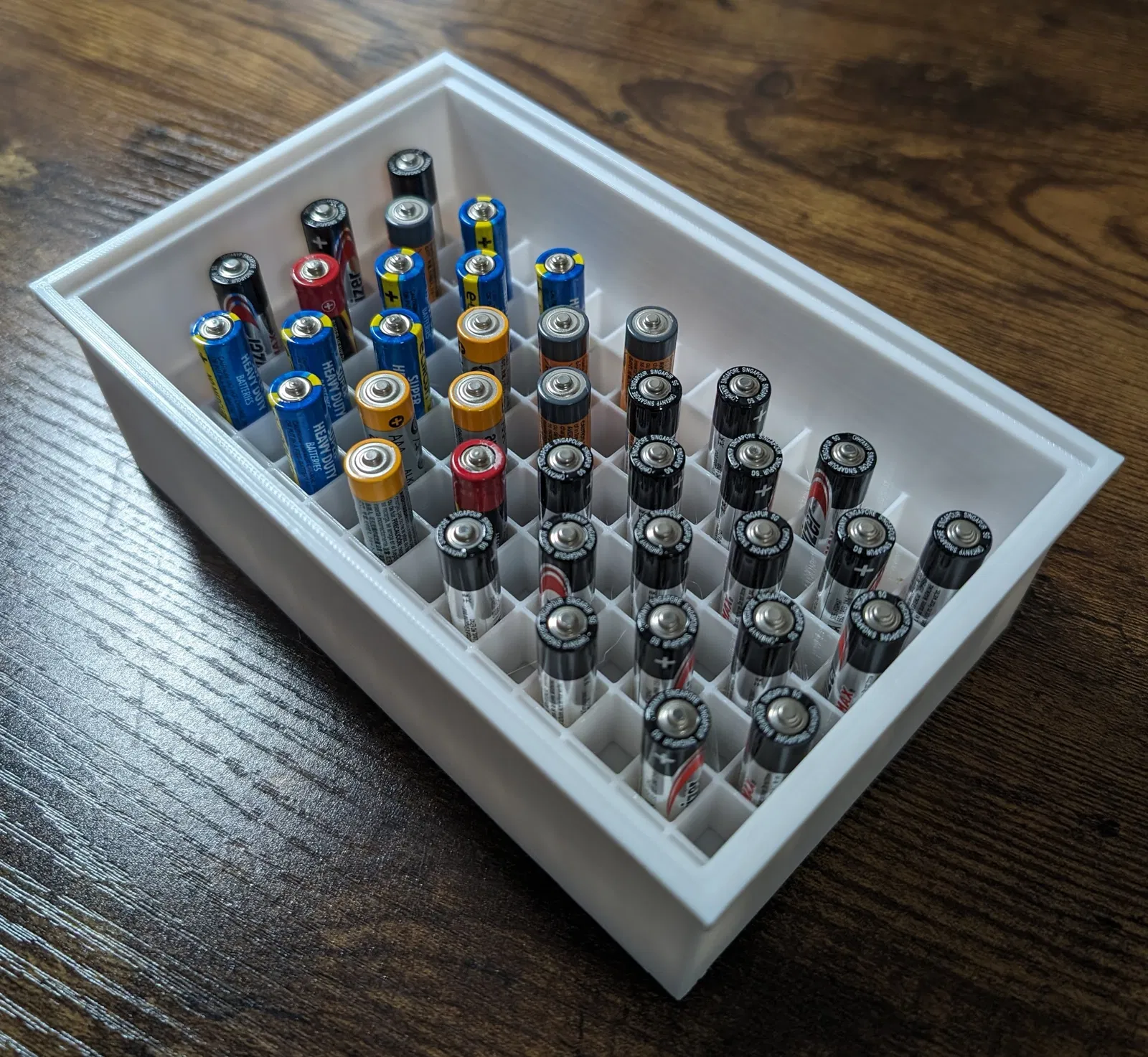 Giải pháp dung lượng lớn cho pin AAA. Các hộp pin khác chỉ chứa được vài viên. Cái này chứa được 104 viên. Các hộp pin khác phải gắn trên tường. Cái này thì để gọn trên kệ. Các thiết kế hộp pin khác chỉ cho phép đặt một hộp ở một chỗ. Cái này có thể xếp chồng lên nhau để tiết kiệm không gian. Có thể xếp chồng với Hộp pin AA, Hộp pin C và Hộp pin D. Nếu bạn thích thiết kế này thì nhấn vào đây để xem các mẫu khác của tôi nhé. Chúc bạn in ấn vui vẻ!