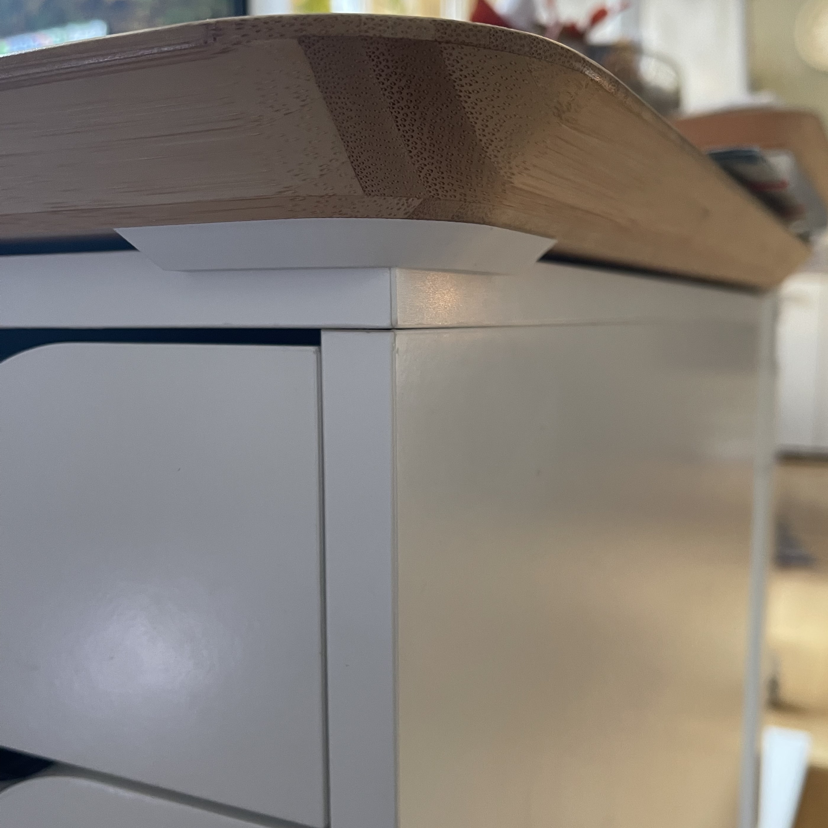 Tôi đặc biệt không muốn gắn cố định để có thể nhanh chóng di chuyển mặt bàn để lau chùi bên dưới và đồng thời không làm hỏng ngăn kéo Ikea Alex bằng vít hoặc keo. Do đó, cái đế này chỉ hạn chế chuyển động ngang của mặt bàn và cho phép tháo ra nhanh chóng bằng cách nhấc nó lên một chút.