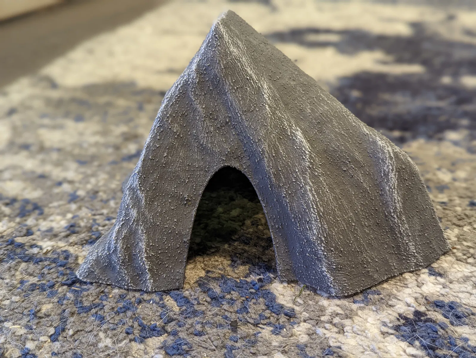 Hang đá hình dáng tự tạo với hai lối vào cho cá, tôm hoặc bò sát. Được thiết kế với thành 2mm, in mật độ 100% không cần hỗ trợ. PLA/PETG đều chìm, khuyến khích PETG cho độ bền lâu dài.