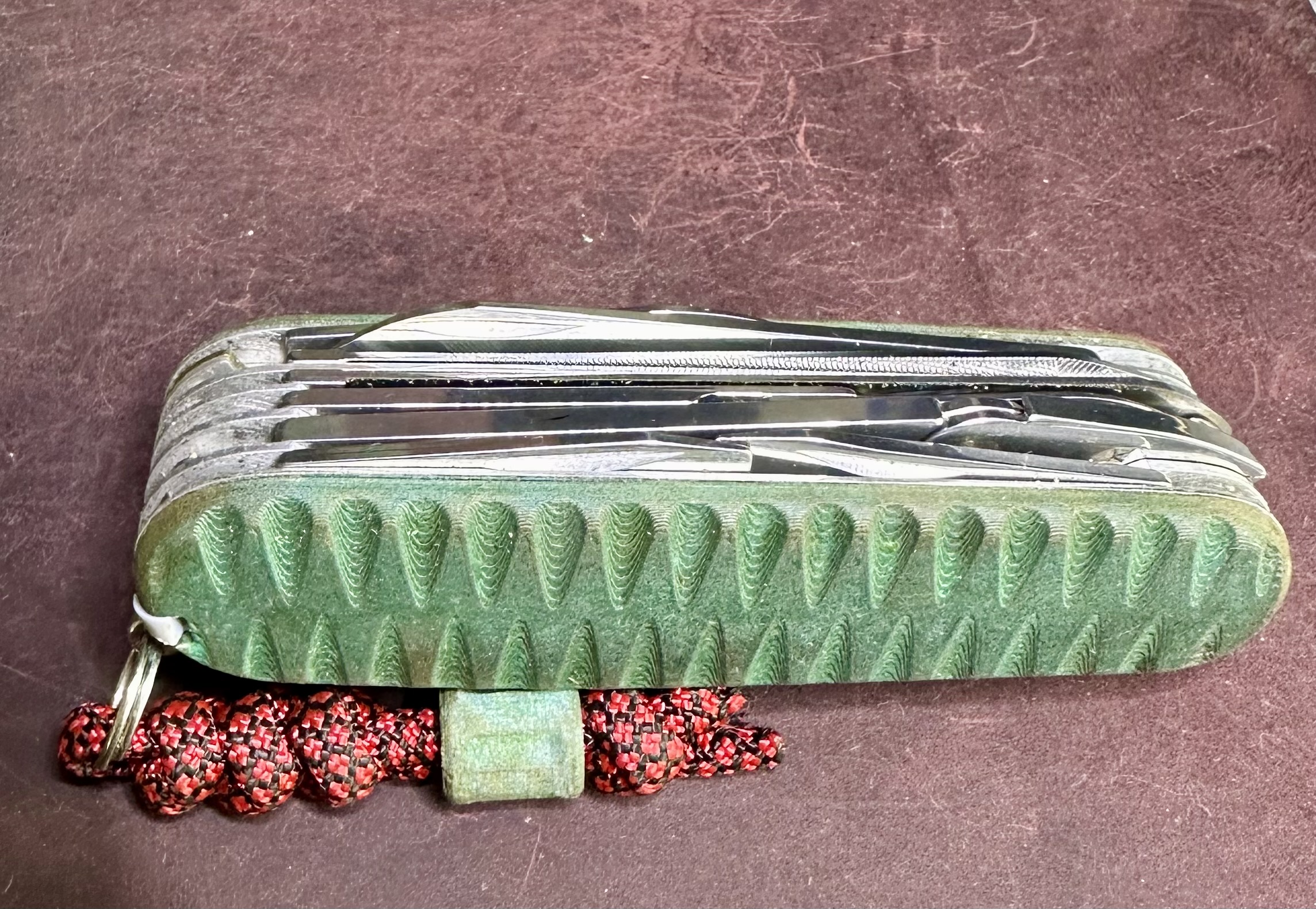 Vỉ cho dao đa năng Thụy Sĩ Victorinox 90mm, có khe cắm tăm và nhíp. Có 2 loại: trơn và có rãnh. Mẫu hiển thị in bằng PLA bronze fill và xử lý làm cũ nhân tạo.