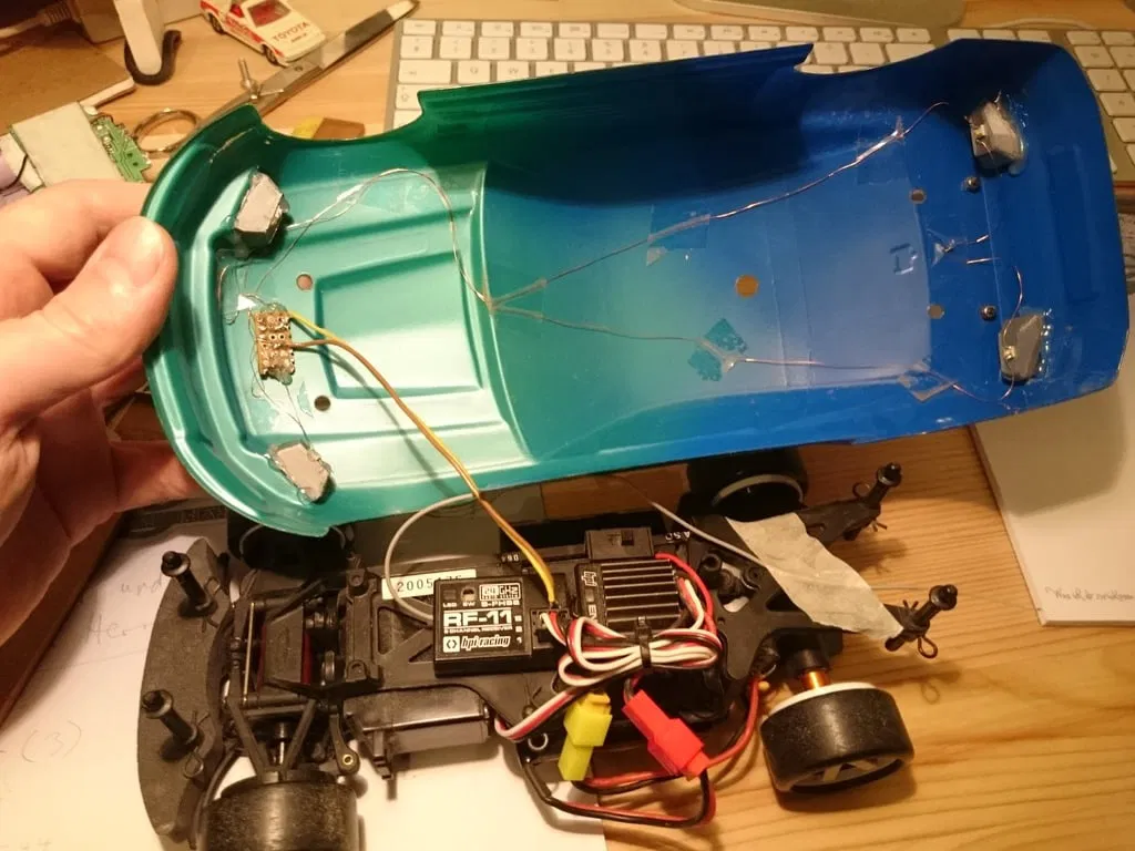 Sử dụng chip LED SMD trắng vuông 4mm cho đèn pha và chip LED đỏ 4x3mm cho đèn hậu. Mình cũng có thêm phiên bản dùng LED tròn 3mm cho mấy bạn xài đồ bình thường.