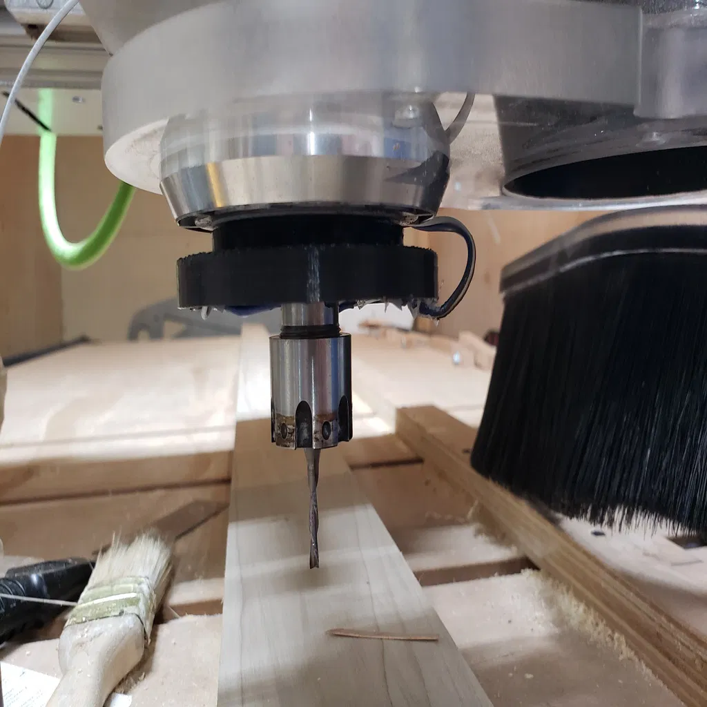 Tui đã cần một cách tốt hơn để nhìn thấy dụng cụ khi cắt trên máy CNC của mình. Hiện tại tui đang xài cái Bosch 1617 cho trục chính. Nó tự làm mát bằng cách hút gió từ trên xuống và thổi ra ngoài. Việc này có xu hướng đẩy bụi ra khỏi chụp hút và vào không khí.