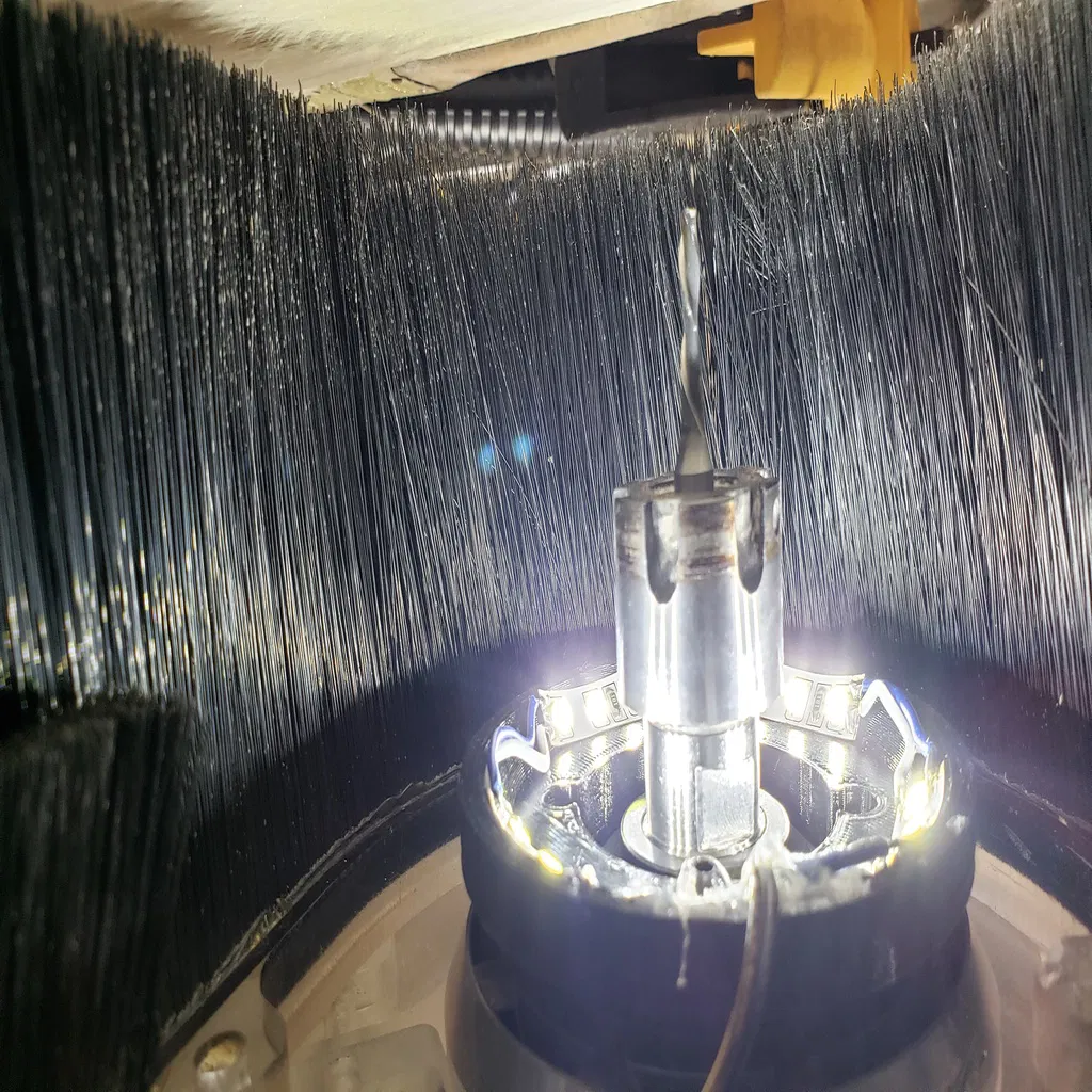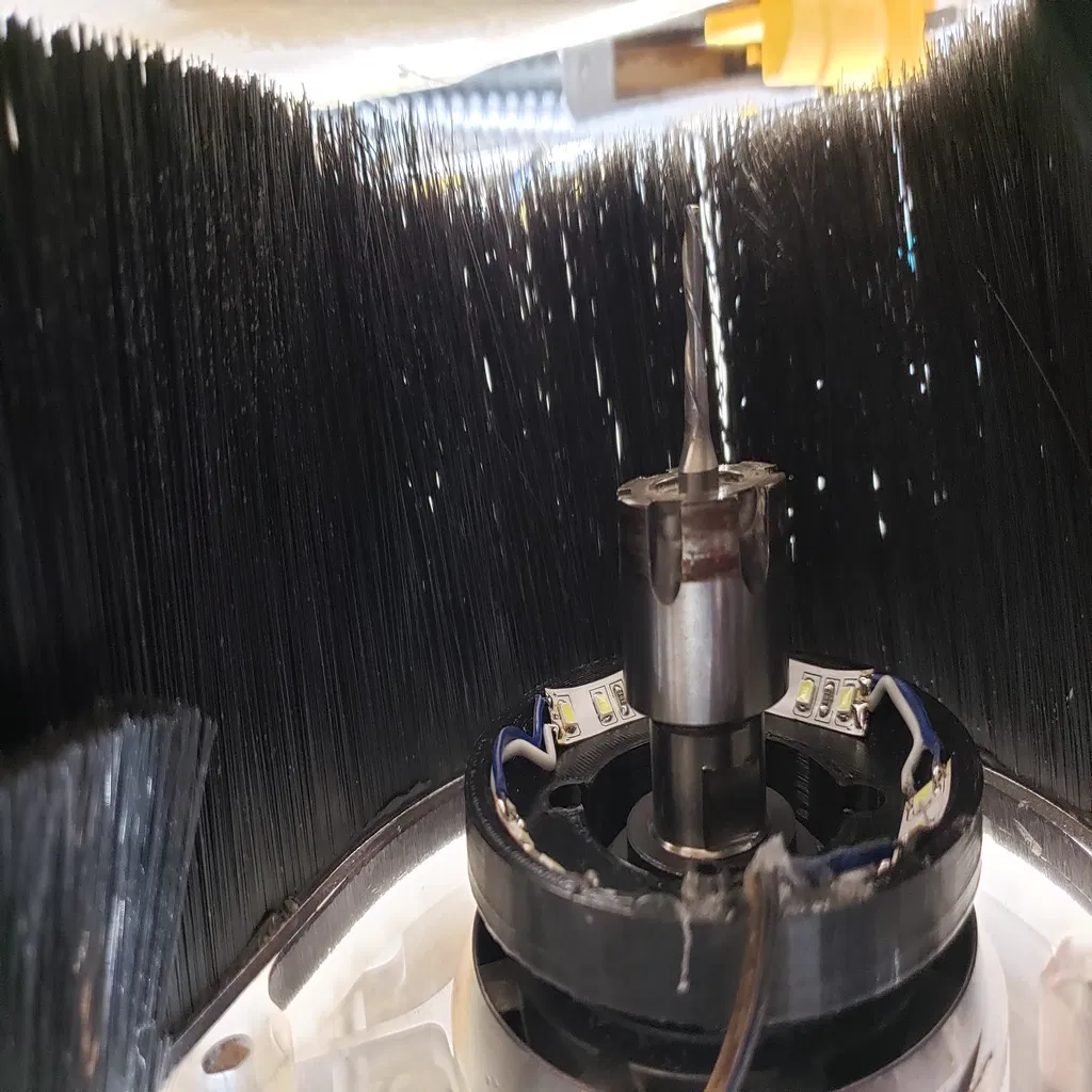 Tui đã chạy một dây nối dài qua các chuỗi cáp của mình khi mới nhận nó để có thể đặt các thiết bị lên đó bất cứ khi nào tui cần. Tui đã dùng bộ nguồn 12v và bộ điều chỉnh độ sáng đèn LED để điều chỉnh độ sáng. Sau đó tui đã luồn dây nguồn qua chụp hút bụi của mình qua một lỗ có đai ốc giữ bên trong. Nó vừa đủ lớn. Tui tin rằng chụp hút bụi này là của kent. CNCROUTERPARTS/Avid CNC đã giới thiệu chụp hút bụi này.