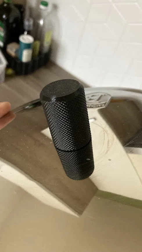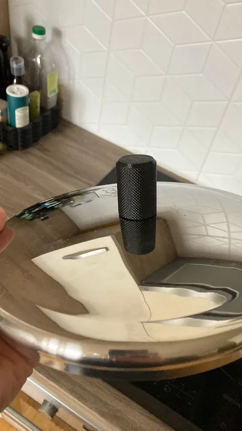 Tay cầm thay thế cho vung nồi nhà bếp, lỗ có đường kính ~6mm và sâu 25mm. Phần đáy hơi cong để khớp với độ cong của vung nồi.