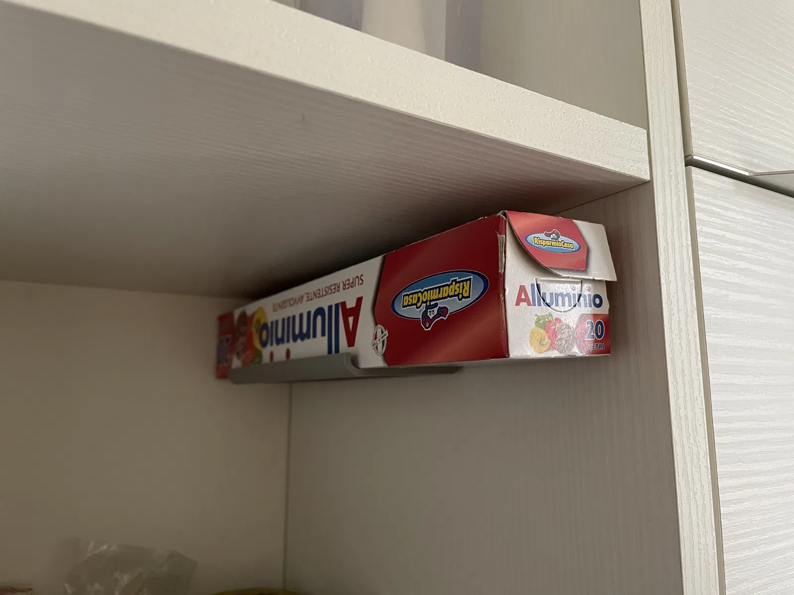 Giá đỡ đơn giản cho nhiều loại cuộn giấy nhà bếp khác nhau. Bạn có thể dùng để đựng giấy bạc, màng bọc thực phẩm, giấy nướng. Cần cố định bằng băng dính hai mặt.