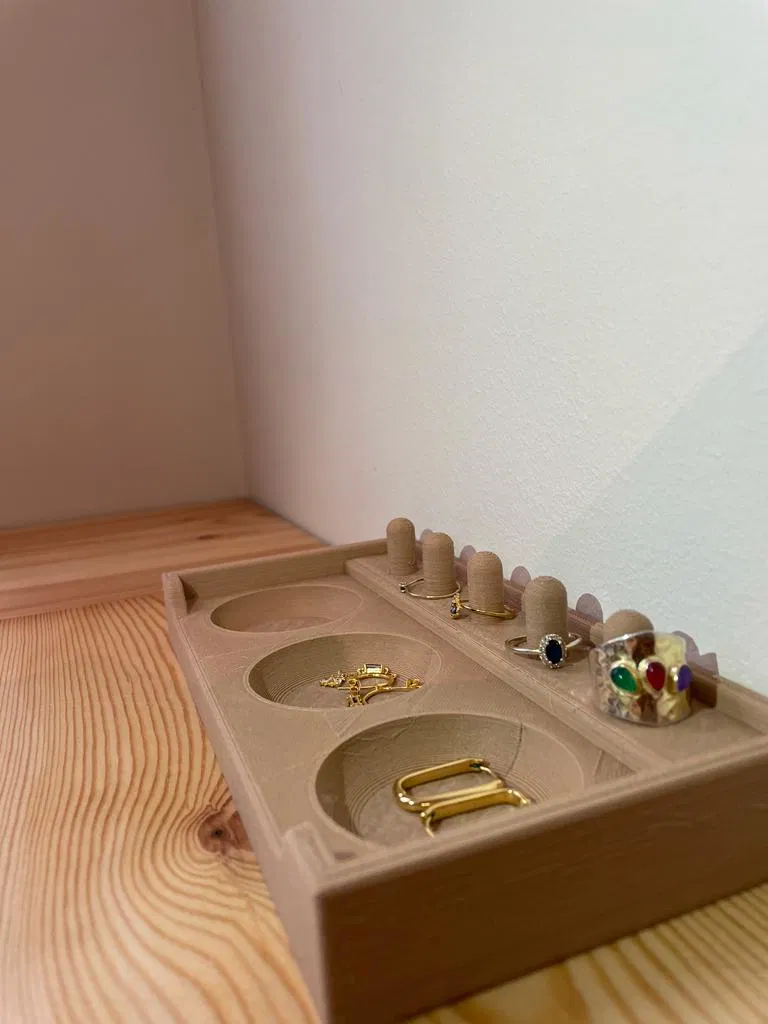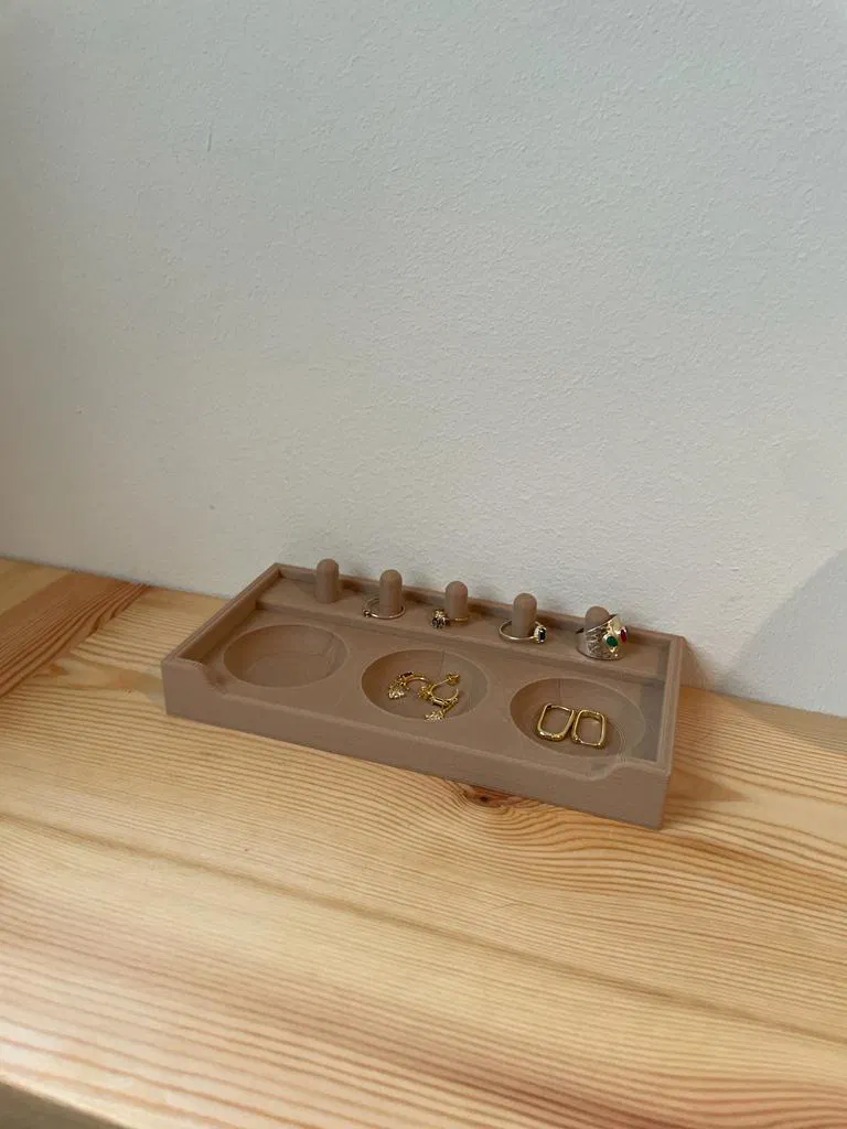 Mô hình đơn giản này giúp bạn sắp xếp nhẫn và bông tai hàng ngày một cách hiệu quả. Rất phù hợp để giữ cho bàn trang điểm của bạn luôn gọn gàng và thẩm mỹ.