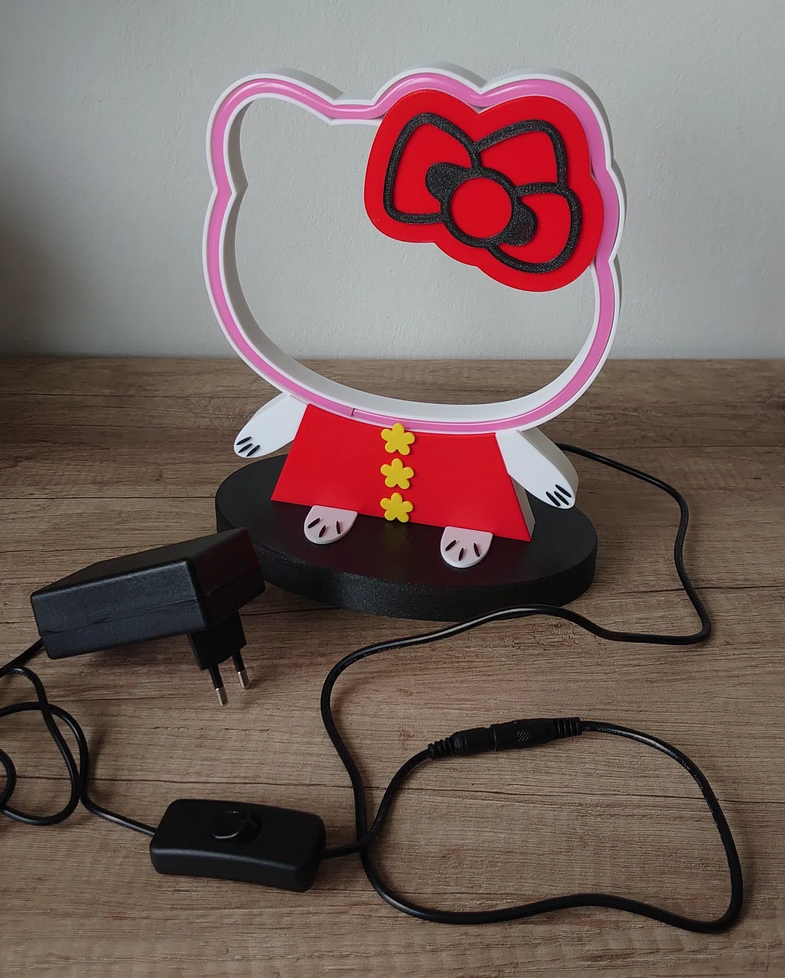 Hoàn thiện đèn neon Hello Kitty với đèn LED neon hồng. Bạn cần ốc vít M4, đai ốc M4, keo dán, nguồn 12V và đèn LED neon hồng khoảng 605mm. Tham khảo các liên kết cung cấp để mua linh kiện.