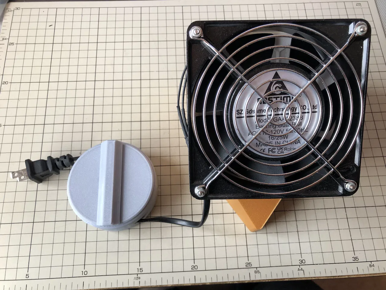 Phần dây nguồn và lưới bảo vệ ngón tay được gắn vào quạt. Bu lông M3x10 được sử dụng ở thời điểm này.