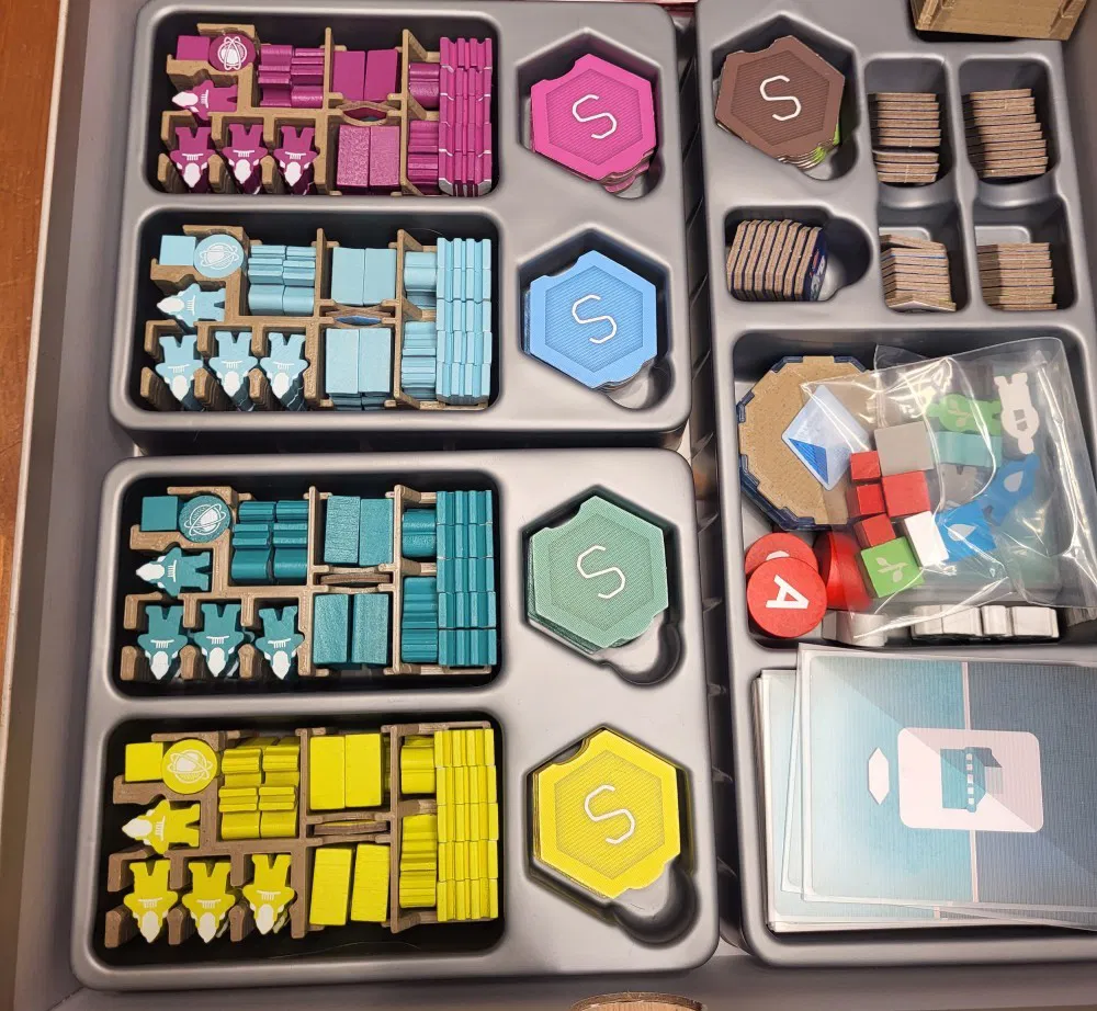 Đây là khay đựng token cho người chơi board game On Mars. Giúp sắp xếp các token như Colonists, Advanced Building markers, Bots một cách nhanh chóng, gọn gàng. Khay còn có chỗ cắm ô Tech shelter và vừa vặn với khay tổ chức nhựa sẵn có của game.