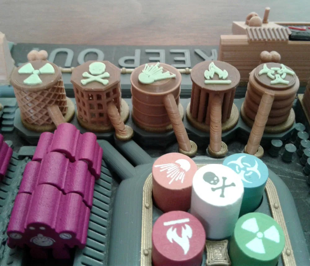 Cả hai bộ phận đều được thiết kế trong Fusion 360 và xuất ra các tệp .STL sang MeshMixer. Hình ảnh các logo và biểu tượng của Weather Machine được tải xuống từ các nguồn trên web, chuyển đổi thành đen trắng trong Gimp và chỉnh sửa, sau đó chuyển đổi thành tệp .SVG bằng Inkscape. Các tệp .SVG sau đó được tải lên Fusion 360 để kéo dài. Đối với robot bị tháo rời, một bức ảnh đã được chụp của một trong các token robot từ trò chơi để tạo một tệp có thể chỉnh sửa cho Gimp.
