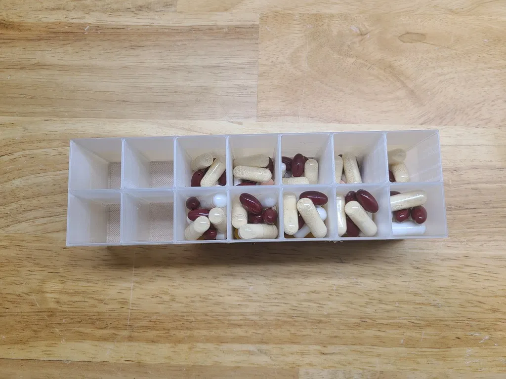 Phần đế chứa thuốc của 7 ngày, cả buổi sáng lẫn buổi tối. Để lấy thuốc ra dễ dàng mà không bị rơi hết ra ngoài, hãy in cái nắp có rãnh, và sử dụng cái rãnh vào ngày bạn muốn lấy thuốc. Khi không sử dụng, nó có thể nằm giữa phần đế và nắp.