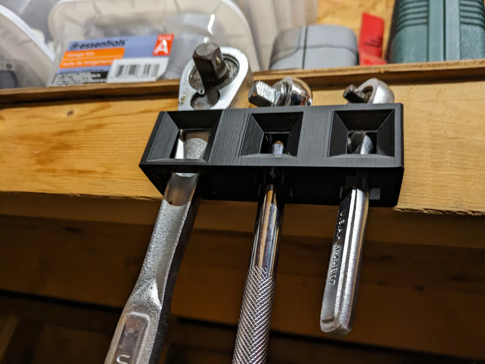 Dụng cụ giữ này dùng ốc vít gỗ hoặc ốc vít tường tiêu chuẩn để gắn lên bề mặt thẳng đứng. Có thể giữ được 3 cái tay vặn, mỗi cái một kích cỡ. Thiết kế ban đầu bị nhỏ nên đã được chỉnh sửa và phóng to, phù hợp với nhiều loại tay vặn nhưng có thể cần điều chỉnh kích thước.