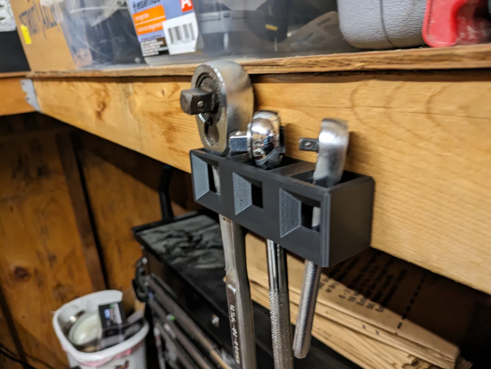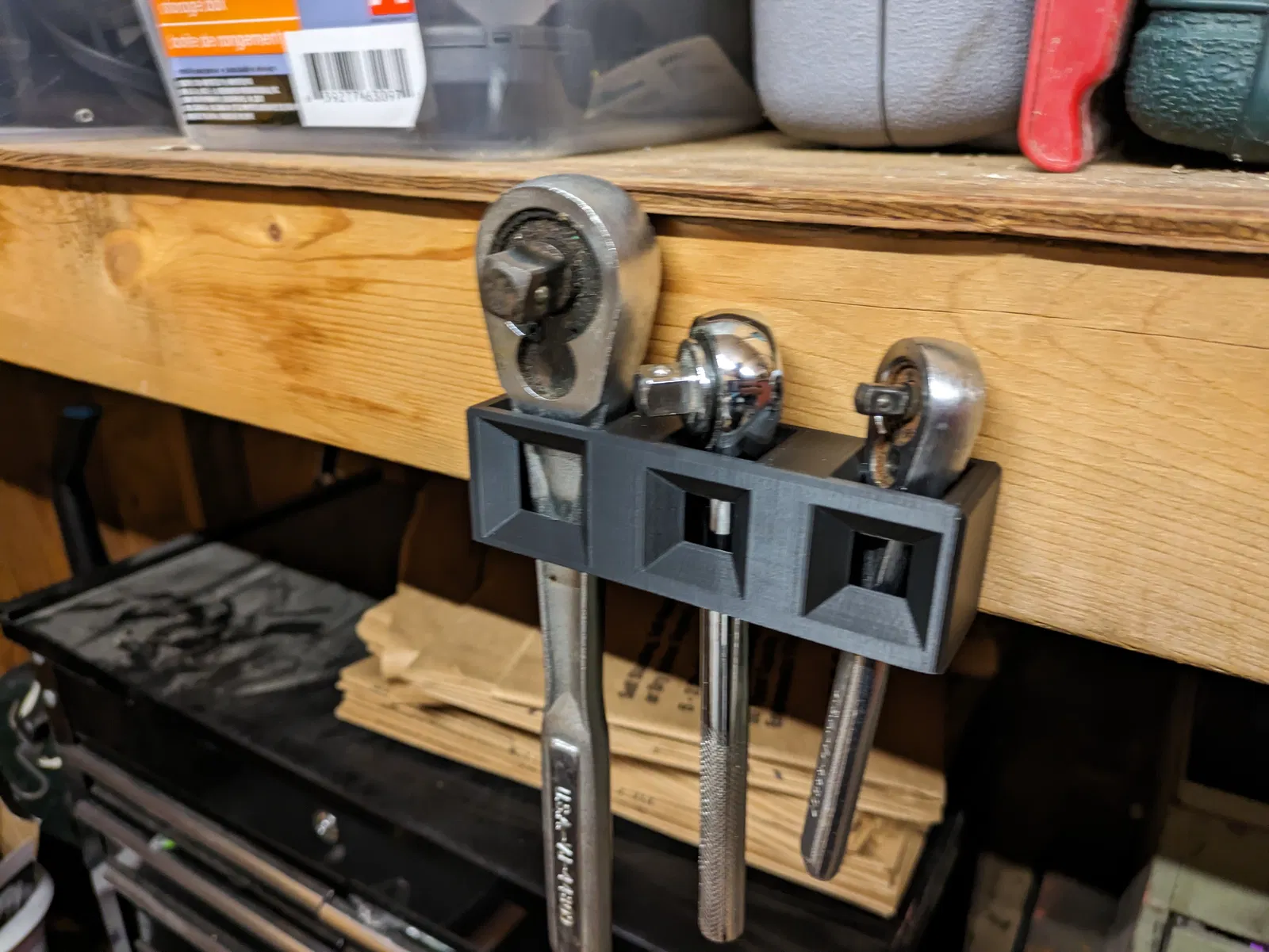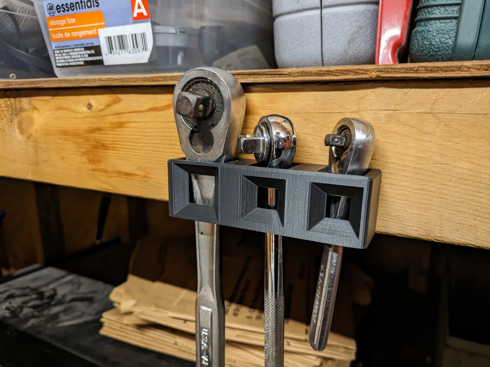 Dụng cụ giữ này dùng ốc vít gỗ hoặc ốc vít tường tiêu chuẩn để gắn lên bề mặt thẳng đứng. Có thể giữ được 3 cái tay vặn, mỗi cái một kích cỡ.