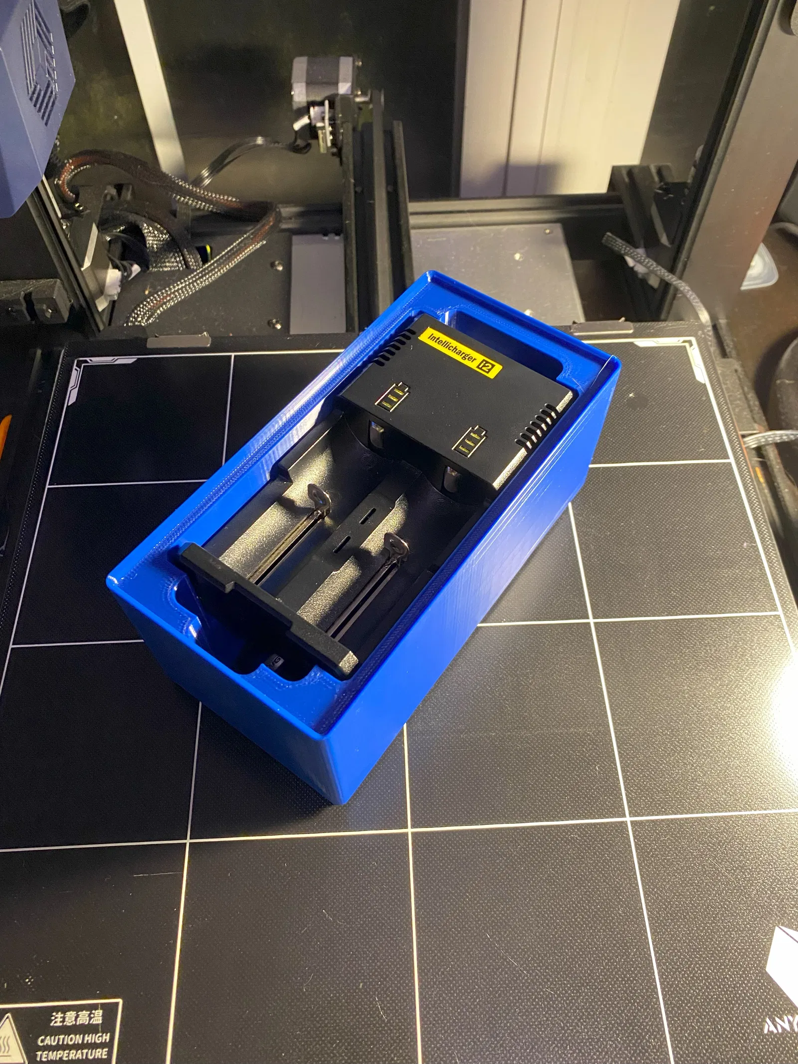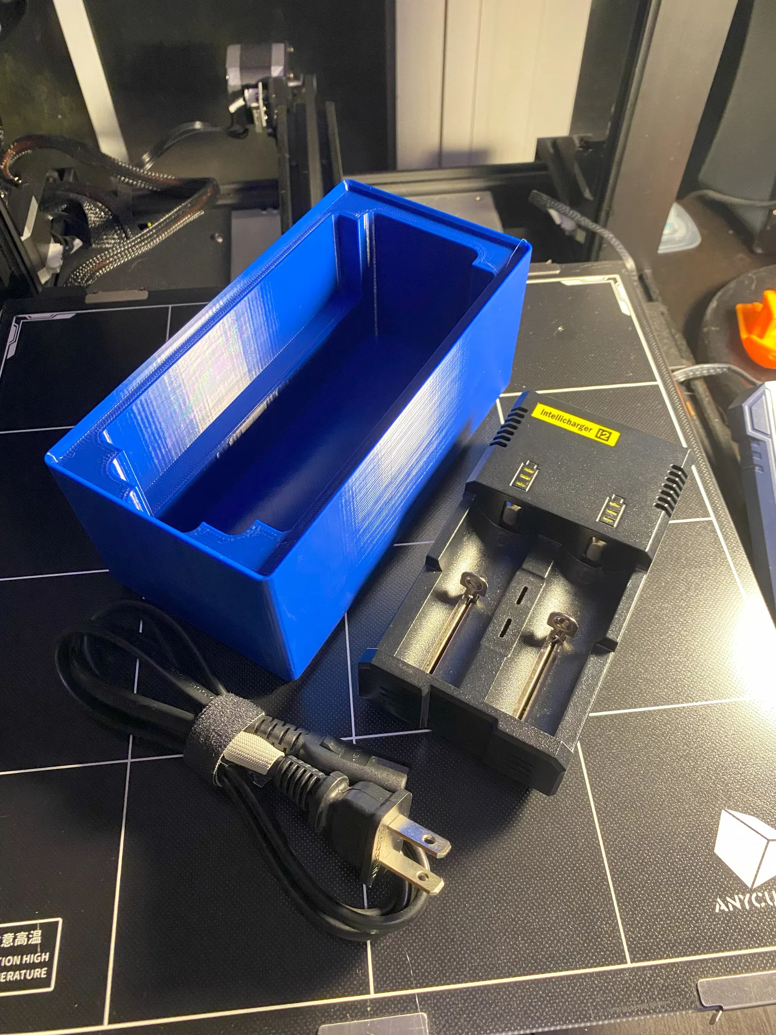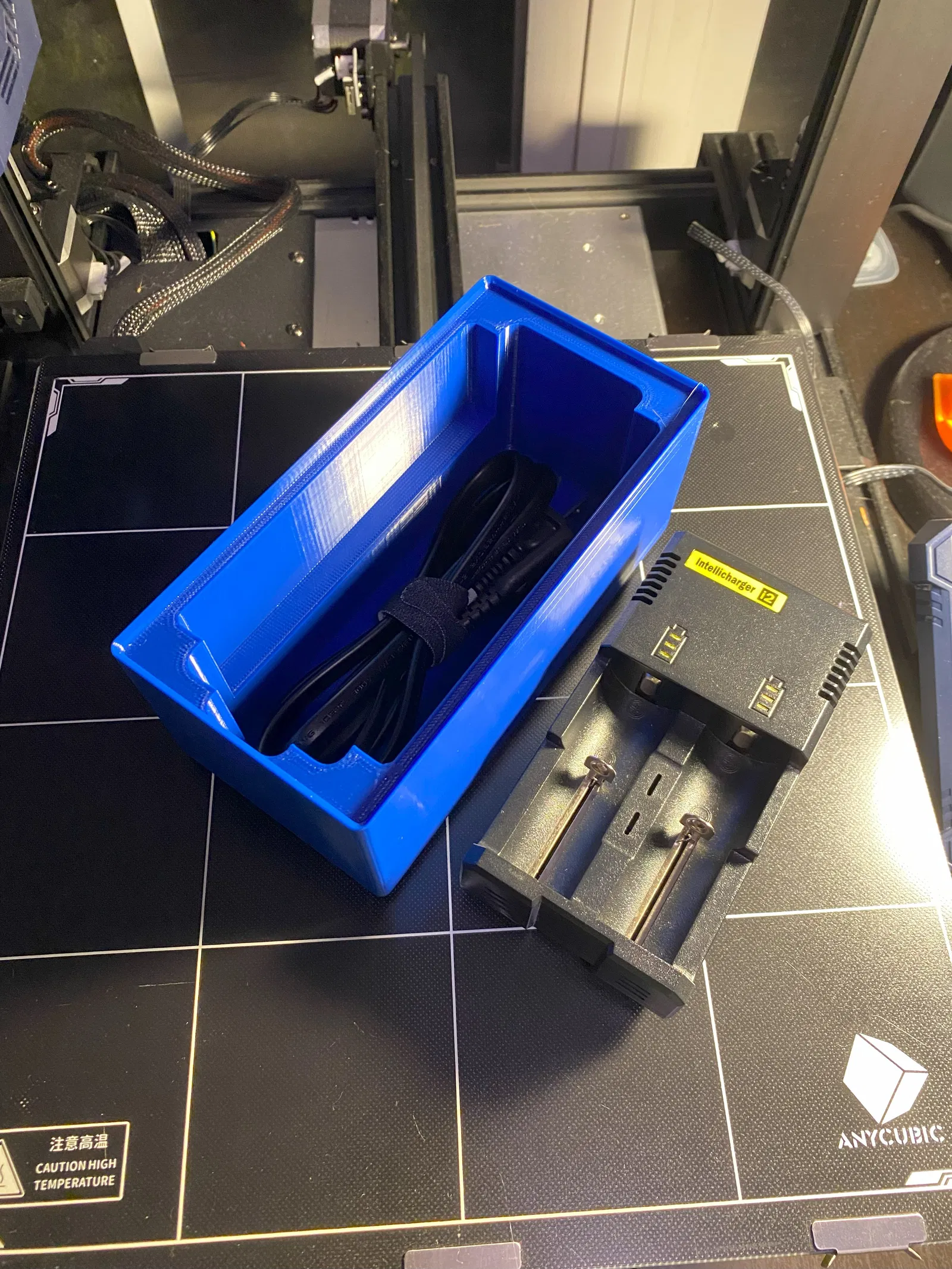 Kệ này để giữ cục sạc Intellicharger i2 và dây nguồn của nó. Mẫu này được thiết kế theo chuẩn Gridfinity 2x4, không có lỗ nam châm.