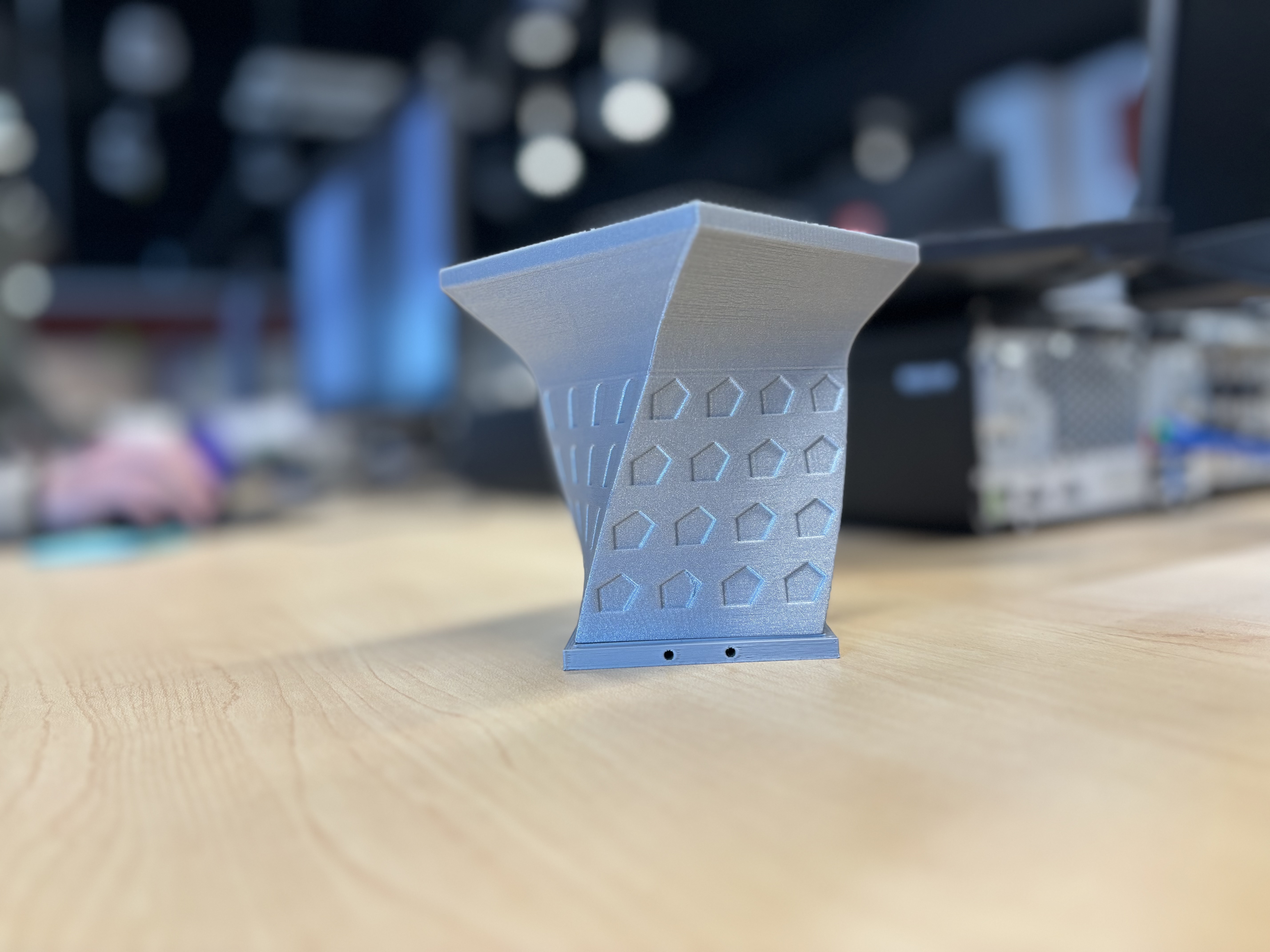 • Đây là một thay đổi nhỏ đối với mô hình của chúng tôi, nhưng đã làm thay đổi đáng kể vẻ ngoài của tầm nhìn ban đầu của chúng tôi. Ban đầu, chúng tôi chỉ dự định tòa nhà có một phần uốn cong, và sân bay trực thăng sẽ thẳng trên đó. Tuy nhiên, không có cách nào để in mô hình này, vì vậy chúng tôi phải làm khác đi.