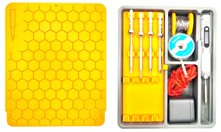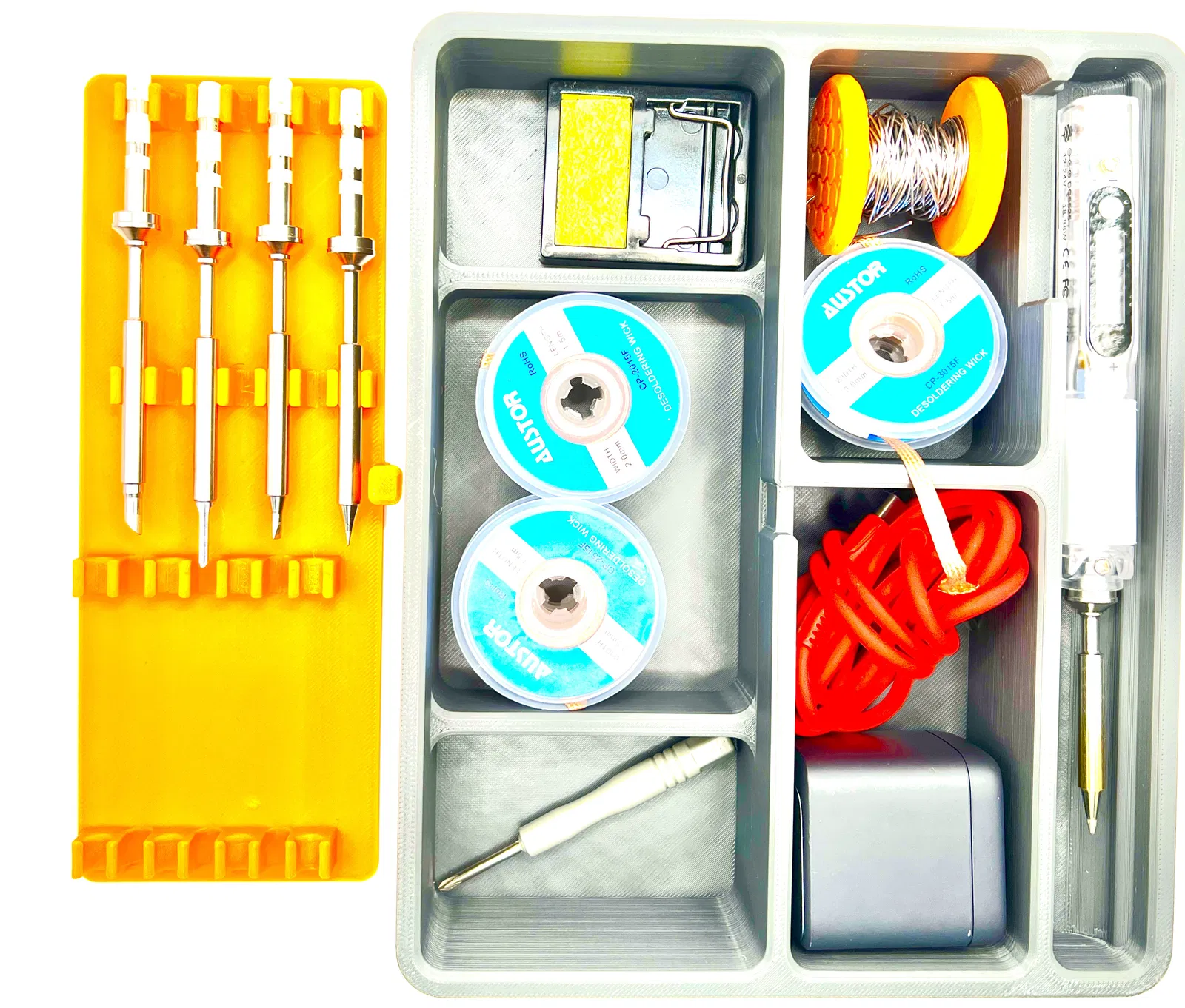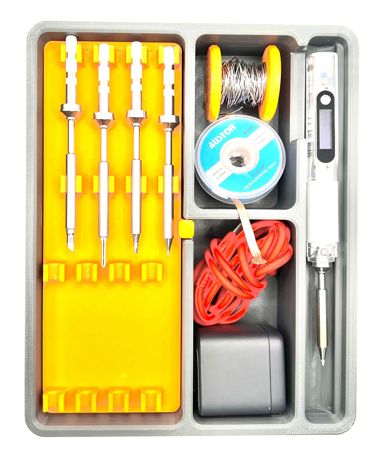 Hộp đựng Pinecil chứa được tới 9 mũi hàn TS100, có khay tháo rời và nhiều ngăn. Nắp trượt tiện lợi, có thể cất dưới đáy hộp khi làm việc. Bao gồm 4 loại nắp và file step để tùy chỉnh.