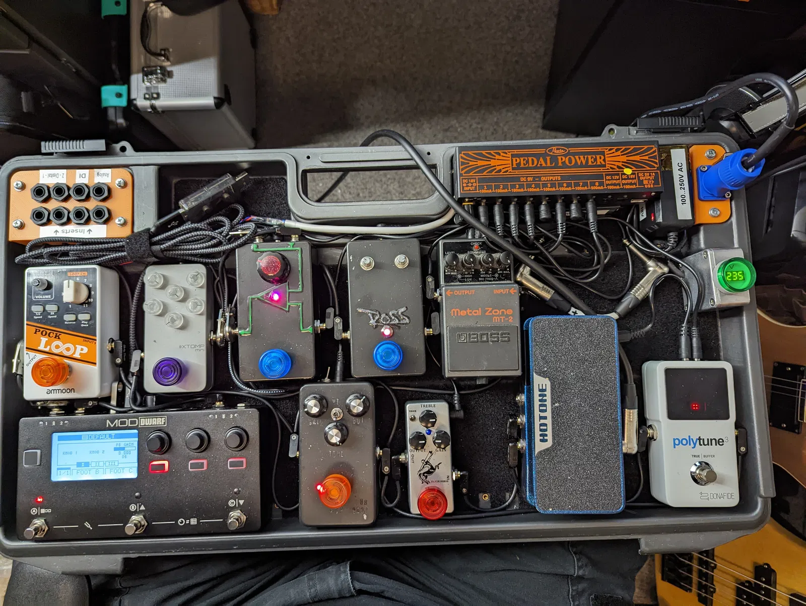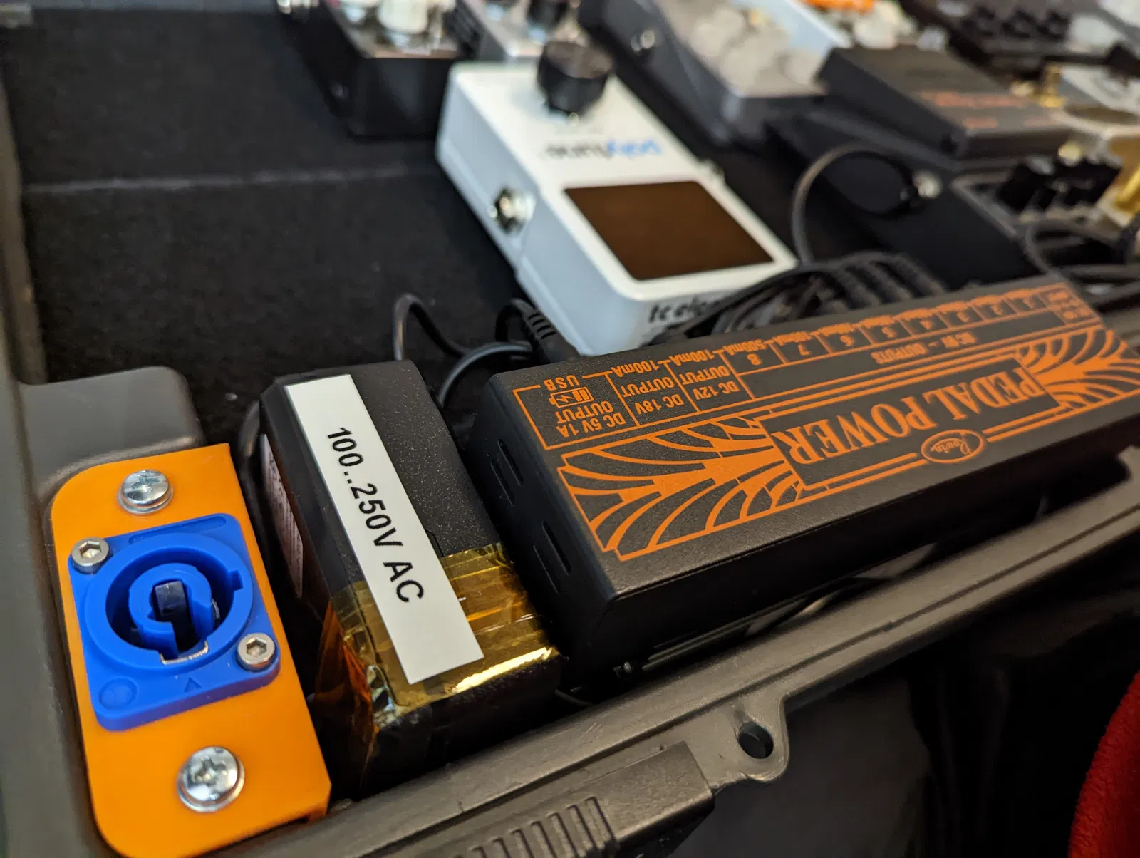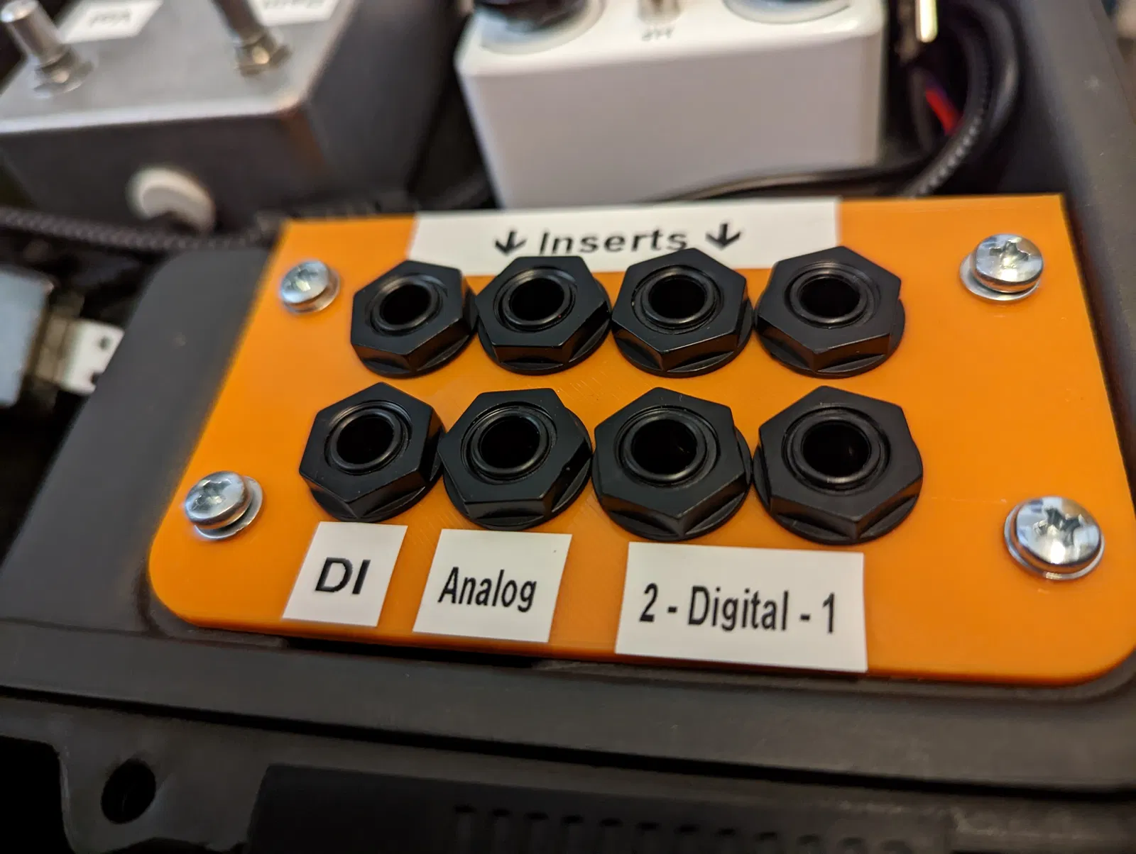 Mặt bảng I/O tùy chỉnh cho vỏ bàn đạp Boss BCB-60. Cổng vào là đầu nối Neutrik Powercon. Cổng ra là 8 x jack 6.3mm. Jack nguồn là Neutrik NAC3MPXXA. Jack 6.3mm là Neutrik NMJ6HFD2.